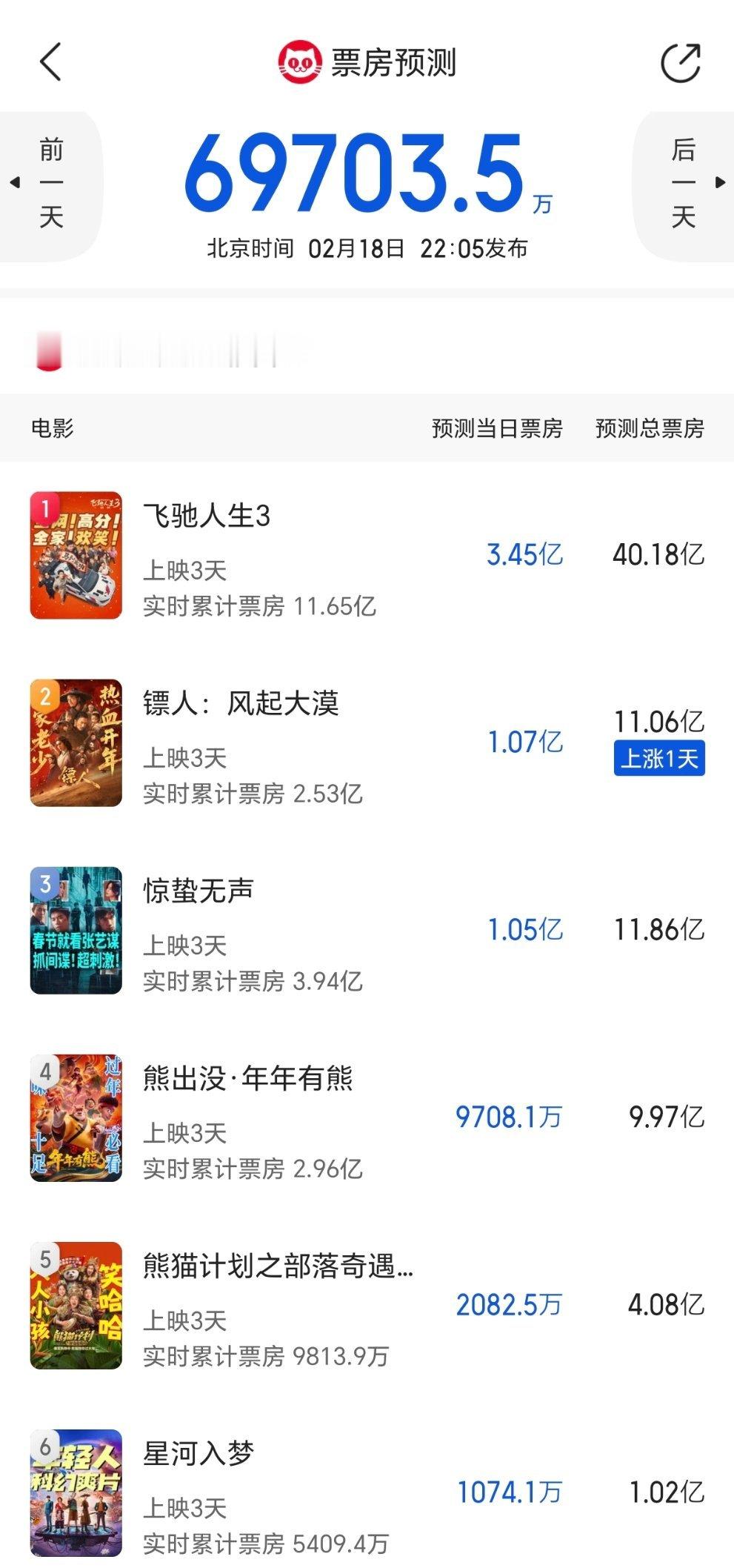 大年初二票房只有镖人跑赢预测,路人慢慢走路进场,发笑ing飞驰预测从50降到40,可以再降点🙄🐻能不能超过惊蛰无声?星河入梦1亿保卫战,已成韩延最血扑电影