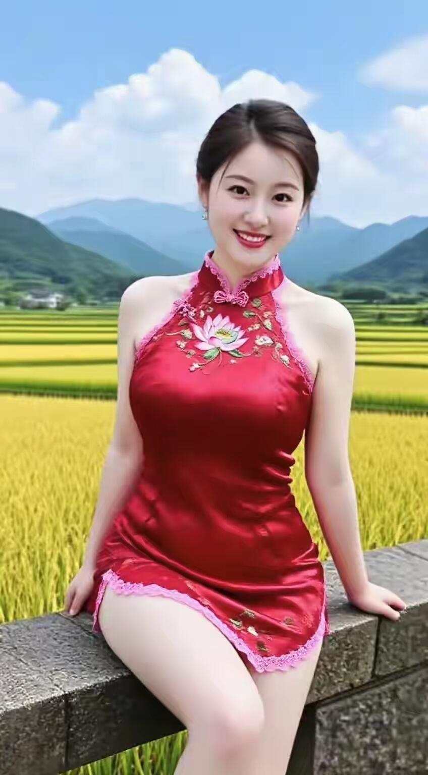 在金黄的稻田旁,穿着旗袍的优雅女子,笑靥如花。
