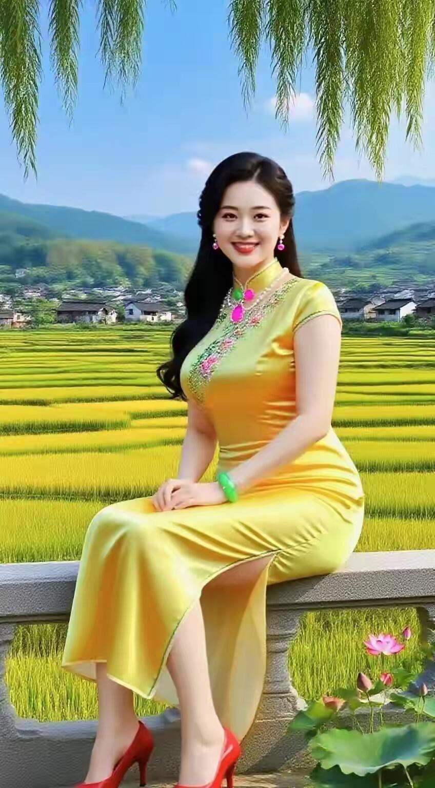 在金黄的稻田旁,穿着旗袍的优雅女子,笑靥如花。