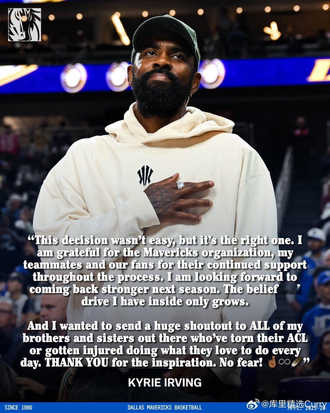 独行侠宣布欧文赛季报销,后者在球队声明中说道: