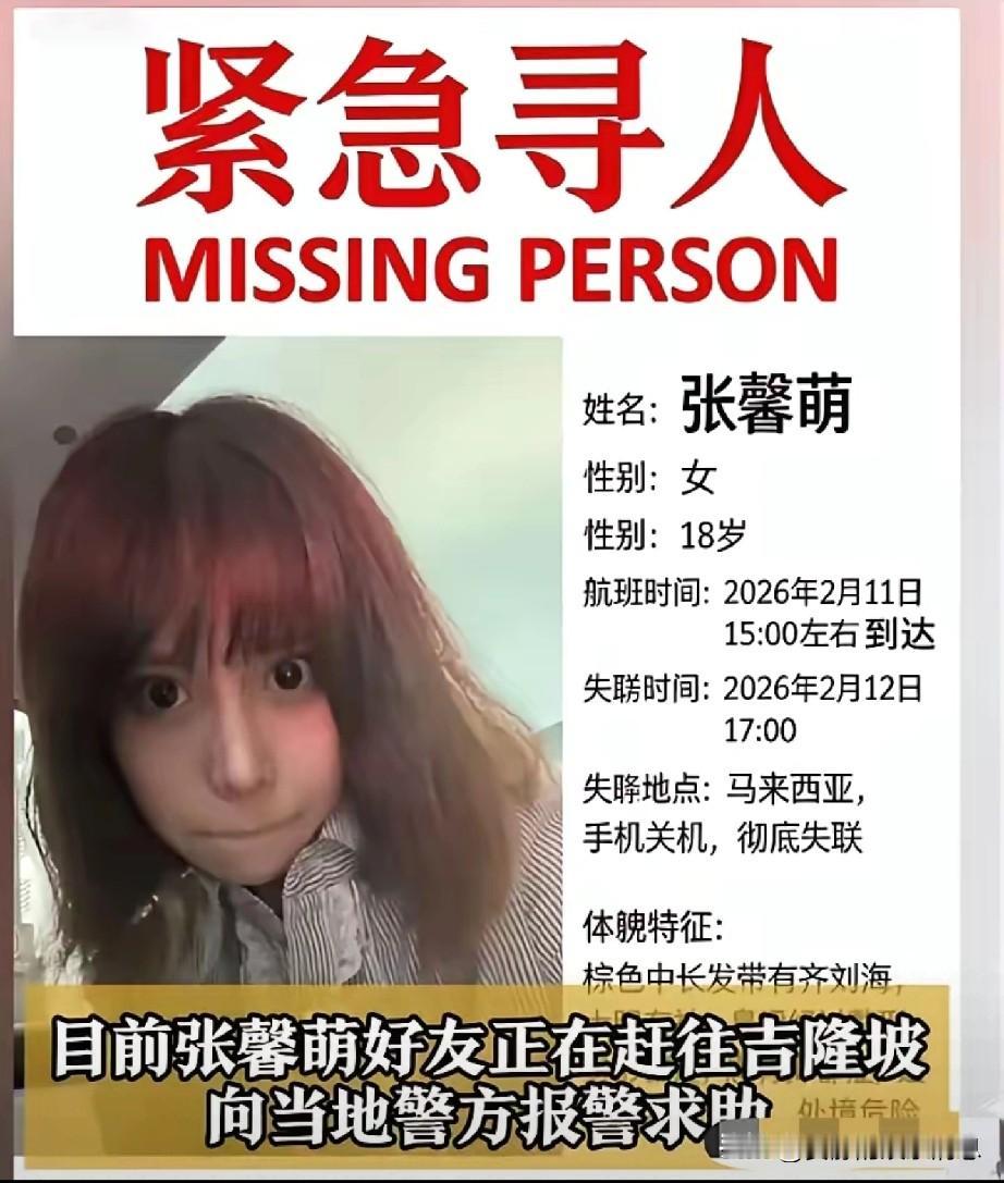 18岁女孩张馨萌失联女孩张馨萌失联已7天,2月11日下午3点抵达马来西亚,2月12日下午5点与家人失去联系。 张馨萌性格温和,平时喜欢旅游,但有心理疾病,需吃药。张馨萌的家人收到她发来的短信,内容让人担忧:“让我趴地上,交出手机。” 家人赶到酒店时发现房间狼藉,物品散落,床单被撕扯。张馨萌的家人很担心她的安危!