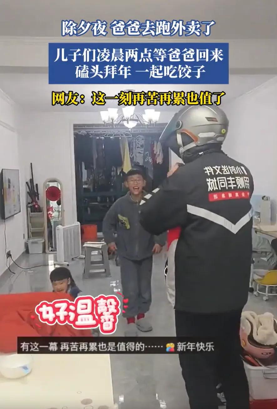 看哭了!安徽,一男子除夕夜并没有在家过年,而是为了多赚点钱出去跑外卖,凌晨2点回家时,本以为老婆和孩子都已经睡了,结果一开门,两个儿子突然跑过来磕头拜年。那一瞬间,一切辛苦都值得了 凌晨两点的安徽街头,寒风像刀子一样刮在脸上。 一个普通的男人,除夕夜不在家守岁,偏要骑着电动车在外跑单。 他不是贪玩,只是想趁着过年单价高,多挣几个钱,让妻儿过得宽裕些。 年夜饭匆匆吃完,他便披上外套出了门,一忙,就忙到了后半夜。 推开家门时,他头盔都没摘,满心以为家人早已熟睡。 没料到,两个小小的身影,一下子扑到了他跟前。 孩子脆生生喊着爸爸,扑通一声跪在地上,认认真真给他磕头拜年。 这一跪,让在外奔波一整晚的男人,当场红了眼眶。 屋里的妻子没多说什么,只是转身进了厨房,给他煮一碗热乎的饺子。 生活本是清苦的,奔波本是疲惫的,可在这一瞬间,所有的累都有了归处。 妻子把这段画面发到网上,只说一句:一家人在一起,就很知足。 网友看得鼻酸,说这才是过年最动人的模样。 没有锦衣玉食,没有大富大贵,只有一个为家拼命的男人,和两个懂得心疼父亲的孩子。 人间的温暖,从不是金钱堆出来的。 是深夜等候的灯,是进门时的一声爸爸,是孩子眼里不加掩饰的依赖。 男人跑的是外卖,扛的是生活,而孩子磕的三个头,敬的是父亲的担当。 这一夜,他赚的不只是工钱,更是这辈子最珍贵的团圆。 苦是真的,累是真的,但幸福,也是真的。