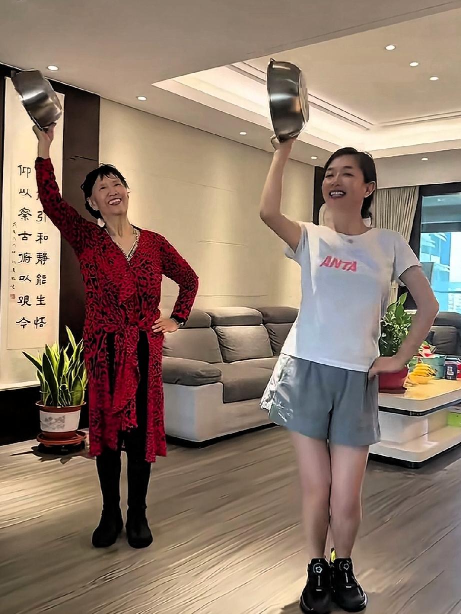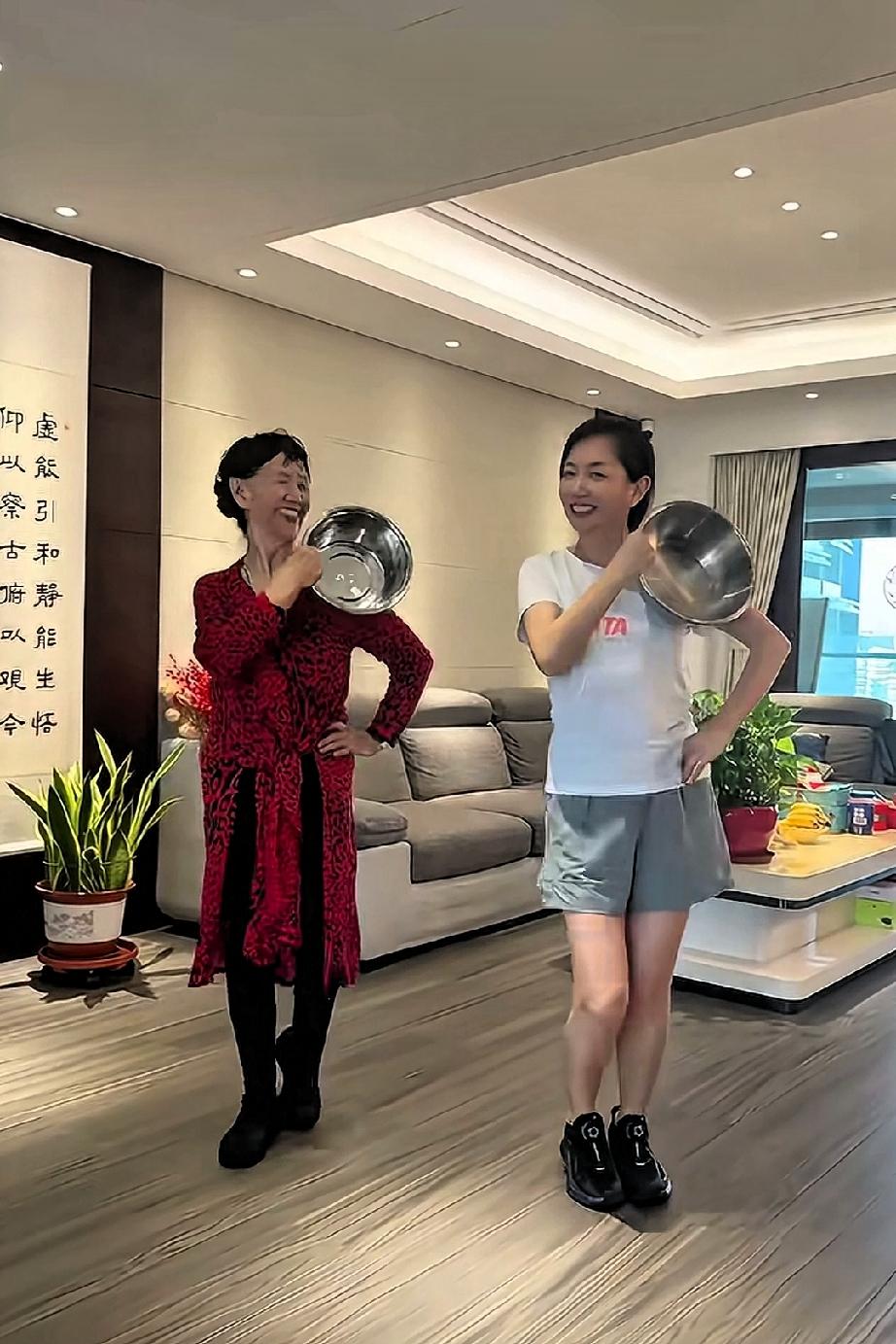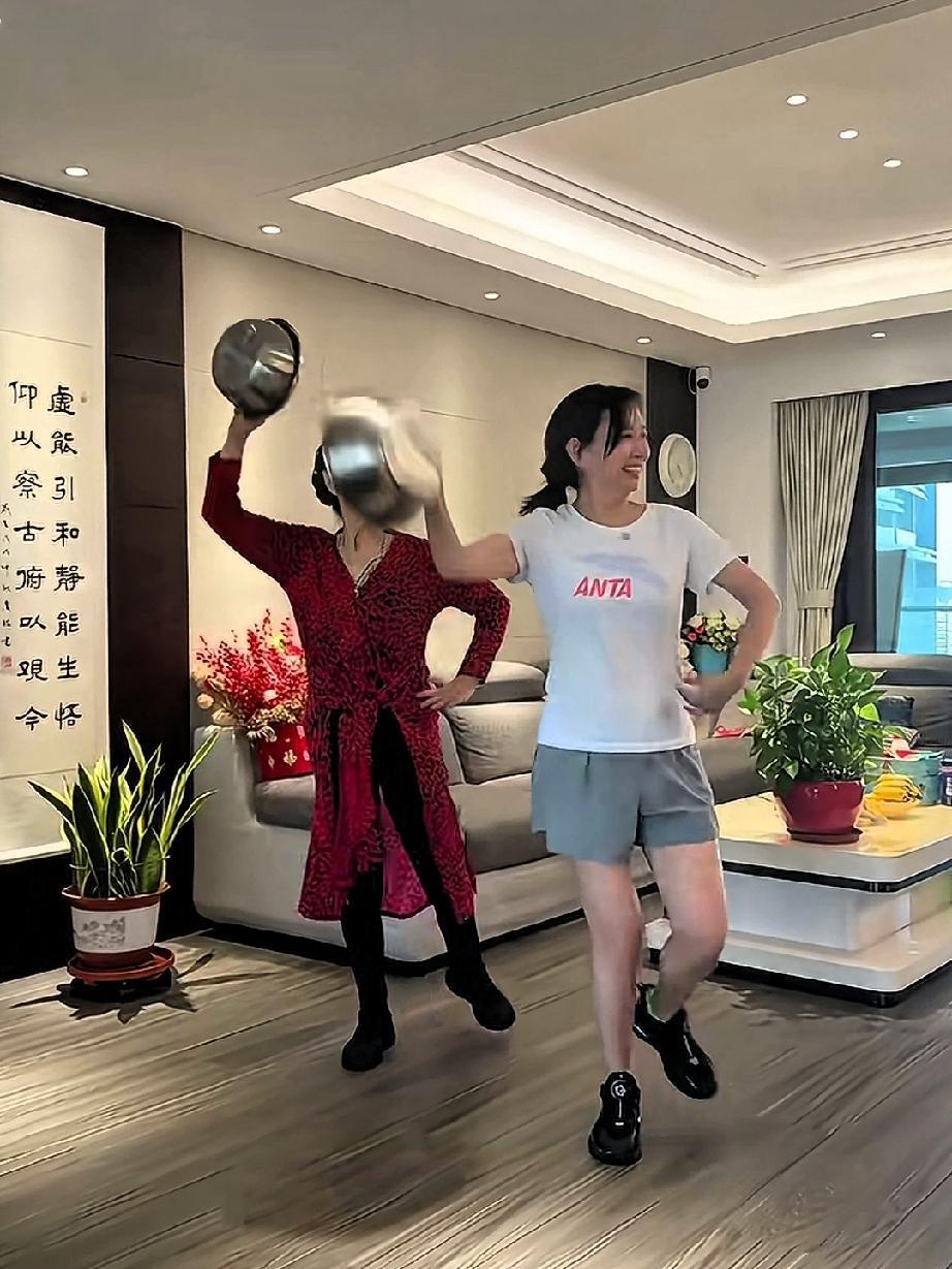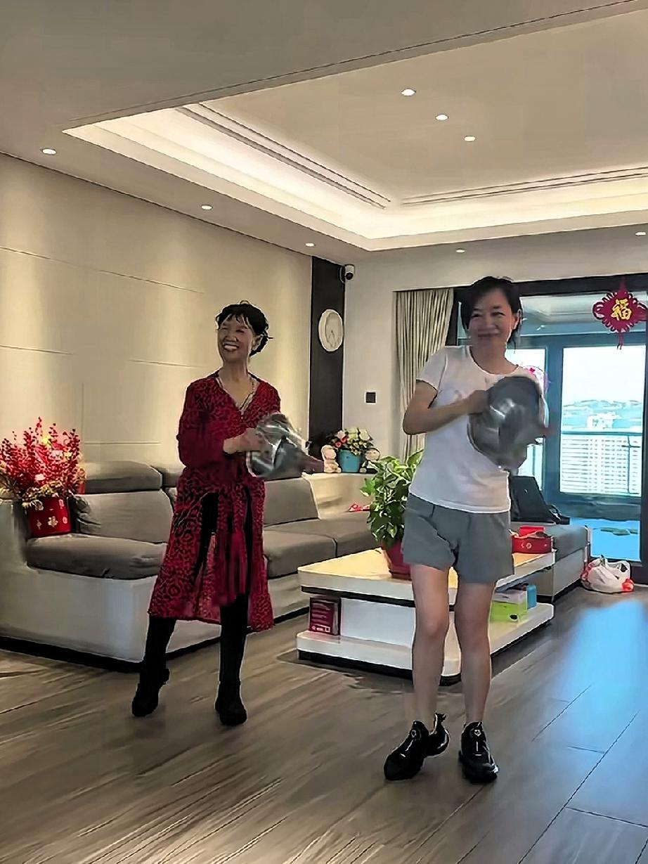 王芳和老妈居家跳舞的一天,她们跳着欢快的新疆舞曲,手里拿的道具是两个不绣纲的盆子。王芳和妈妈长的很像,老妈虽然说七十多岁了,但依然舞姿优美体态轻盈,母女俩人在一起享受幸福的时光。
