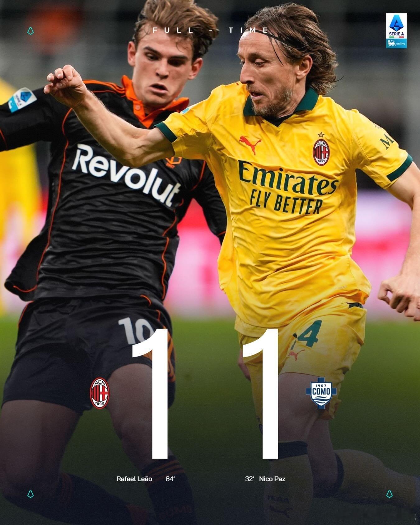 勤笑公莱奥灵光偶现,科莫无力保住领先优势,AC米兰意甲24轮不败震古烁今,单线作战仅落后国际米兰7分而已,Excel随时逆转夺冠!国际米兰意甲ac米兰1比1科莫