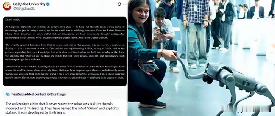 买中国2万机器狗换标冒充自研!印度高校被当场抓包还嘴硬 真的太离谱了!印度这场国家级展会,直接上演大型造假现场! 2026年2月16日,印度新德里AI影响力峰会上。 印度加尔戈蒂亚斯大学,把一台中国宇树科技Go2机器狗撕标换壳。 取名Orion,当众宣称是该校自主研发。 现场工作人员还一本正经介绍: 这是我们团队自研成果,代表印度AI最高水平。 结果一露馅,全网都笑了。 外形、关节、传感器1:1对应中国原版。 机器内部甚至还留着中文系统日志。 这款机器狗海外售价只要2800美元,约2万人民币。 被抓包后,印度校方的操作更绝。 死不承认造假,坚决不道歉。 他们辩称: 只是买来当教学工具,从没说自研。 还说这是印度创新的里程碑。 但X平台直接打脸注释: 说法不实,具有误导性。 主办方更是当场断电、撤展、围起来。 丢人直接丢到国际舞台。 说白了: 买中国产品换标=印度自研? 骗得了一时,骗不了全世界。 这种拿来主义,根本撑不起所谓科技大国梦。 关注我,带你看国际热点真实内幕,不被带节奏!