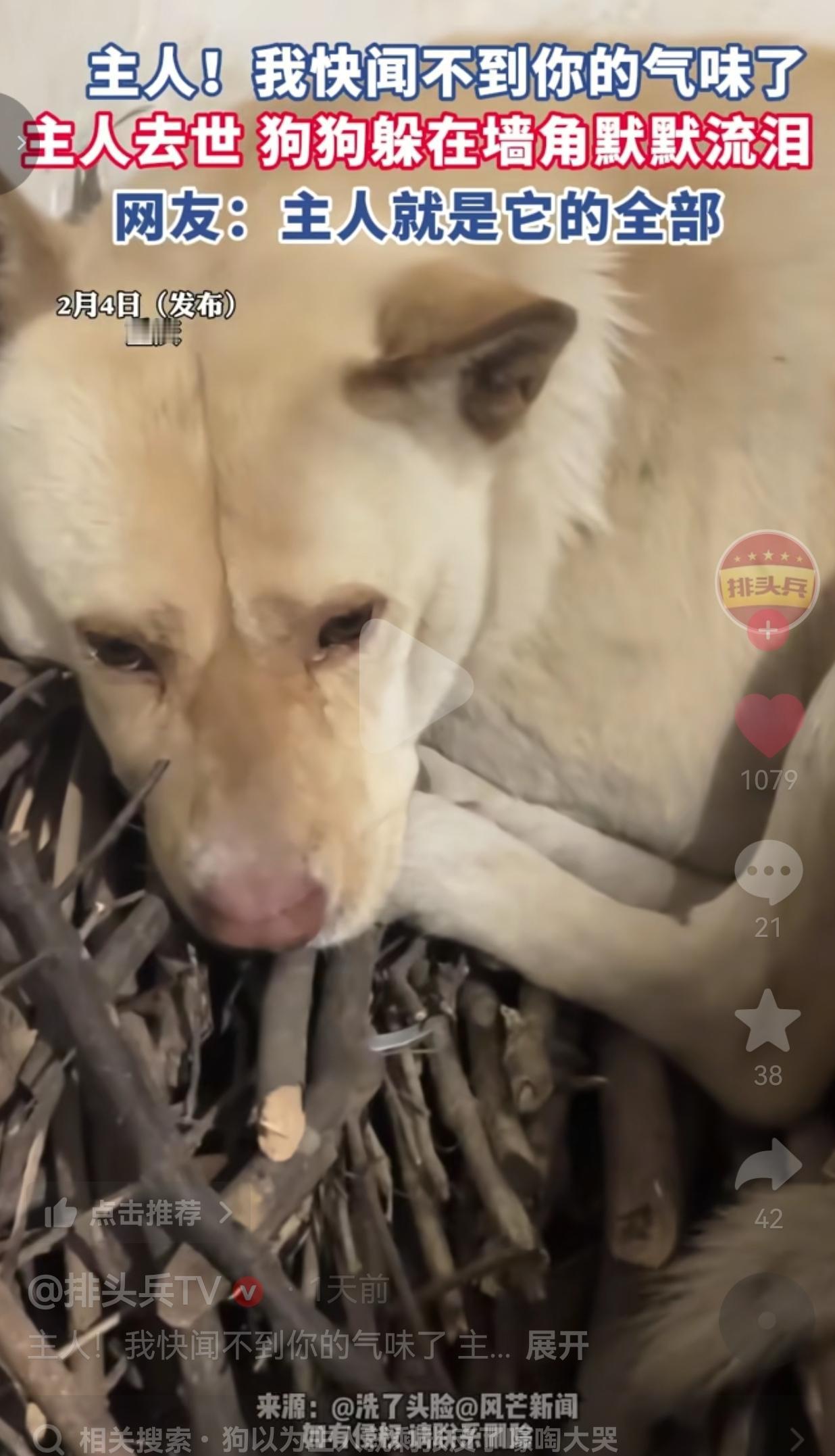 近日,重庆一位抖音博主发布的视频,让无数网友瞬间破防。那句“主人,我快闻不到你的气味了”,短短一句话,戳中了所有人的泪点。 视频里,一只土黄色的狗狗蜷缩在墙角的柴火堆里,眼睛红红的,眼角挂着泪痕,脑袋有气无力地搭在爪子上,时不时发出几声呜咽。 它的主人已经离开了这个世界,而它,还在固执地守着这个家,守着主人最后残留的气息。 狗狗的世界何其简单,主人便是它的全部。那熟悉的气味,是它感知爱的唯一坐标。 主人离去,气味消散,它躲在墙角默默流泪,不是矫情,是它真的失去了整个世界。它在拼尽全力留住思念的模样,让人心碎。 有的网友说: “它的世界里,主人就是它的全部啊。” 也有的网友说:“我家狗狗也老了,看完视频赶紧去抱了抱它,眼泪止不住地流。” 还有的网友说: “人穷极一生追求的忠诚与爱,原来就藏在一颗毛茸茸的脑袋里。” 是啊,狗狗的世界真的很小。它们不会说话,却用一生的时间,把所有的爱和信任都给了一个人。 在它眼里,主人是清晨的第一缕阳光,是傍晚回家的脚步声,是深夜里温暖的抚摸。 它会在门口等你,会在你难过时蹭你的手,会在你离开时,用那双湿漉漉的眼睛,一直目送你远去。 可当这一切突然消失,它的世界,也就塌了。人总在寻觅忠诚与真心,可这份不掺任何杂质的爱,却被一只小生命捧在手心。 狗狗不知道什么是“去世”,它不懂离别,只知想念。它只知道,那个每天给它喂饭、陪它玩耍的人,再也不会回来了。 它会在熟悉的角落嗅来嗅去,试图抓住最后一丝熟悉的气味。它会在门口蹲守,期待着下一秒,那扇门会再次打开,出现那个熟悉的身影。它会在深夜里发出呜咽,那是它在无声地哭泣,在呼唤那个再也不会回应它的名字。 它不懂生离死别,只懂“我要等你回来”。 这种纯粹的深情,比任何海誓山盟都更让人心碎,怎不让人心疼落泪。 我们总说,狗狗是人类最好的朋友。 可我们有没有想过,在它的世界里,我们就是它的全世界? 我们会因为工作忙,忽略它的陪伴;会因为心情不好,对它发脾气;会因为搬家、出差,轻易地把它托付给别人。可它呢?无论我们怎么对它,它都会摇着尾巴,一如既往地爱我们、信任我们。 它的爱,不掺任何杂质,不求任何回报。只要你在,它就满心欢喜。你不在,它就用一生去等待。 大家觉得呢?欢迎大家评论区讨论留言。