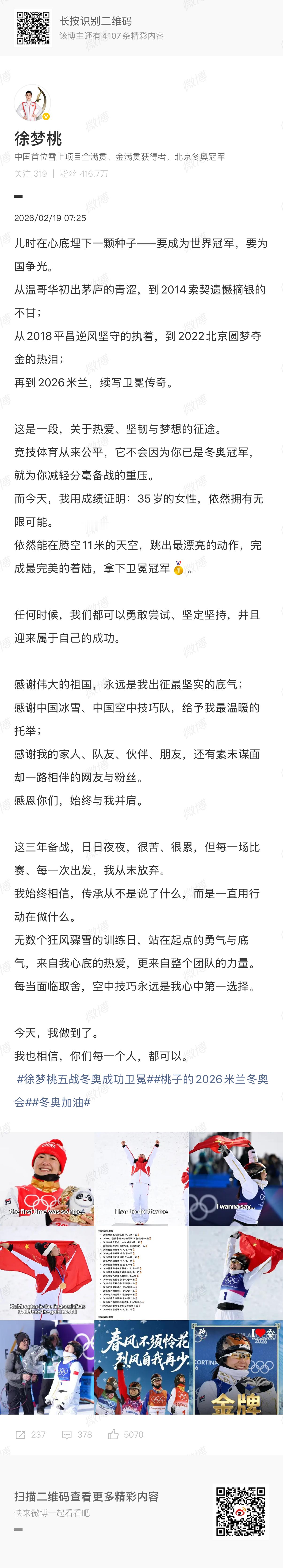 儿时在心底埋下一颗种子——要成为世界冠军,要为国争光。从温哥华初出茅庐的青涩,到2014索契遗憾摘银的不甘;从2018平昌逆风坚守的执着,到2022北京圆梦夺金的热泪;再到2026米兰,续写卫冕传奇。这是一段,关于热爱、坚韧与梦想的征途。竞技体育从来公平,它不会因为你已是冬奥冠军,就为你减轻分毫备战的重压。而今天,我用成绩证明:35岁的女性,依然拥有无限可能。依然能在腾空11米的天空,跳出最漂亮的动作,完成最完美的着陆,拿下卫冕冠军🥇。任何时候,我们都可以勇敢尝试、坚定坚持,并且迎来属于自己的成功。感谢伟大的祖国,永远是我出征最坚实的底气;感谢中国冰雪、中国空中技巧队,给予我最温暖的托举;感谢我的家人、队友、伙伴、朋友,还有素未谋面却一路相伴的网友与粉丝。感恩你们,始终与我并肩。这三年备战,日日夜夜,很苦、很累,但每一场比赛、每一次出发,我从未放弃。我始终相信,传承从不是说了什么,而是一直用行动在做什么。无数个狂风骤雪的训练日,站在起点的勇气与底气,来自我心底的热爱,更来自整个团队的力量。每当面临取舍,空中技巧永远是我心中第一选择。今天,我做到了。我也相信,你们每一个人,都可以。徐梦桃称是浪姐首位冬奥会卫冕冠军