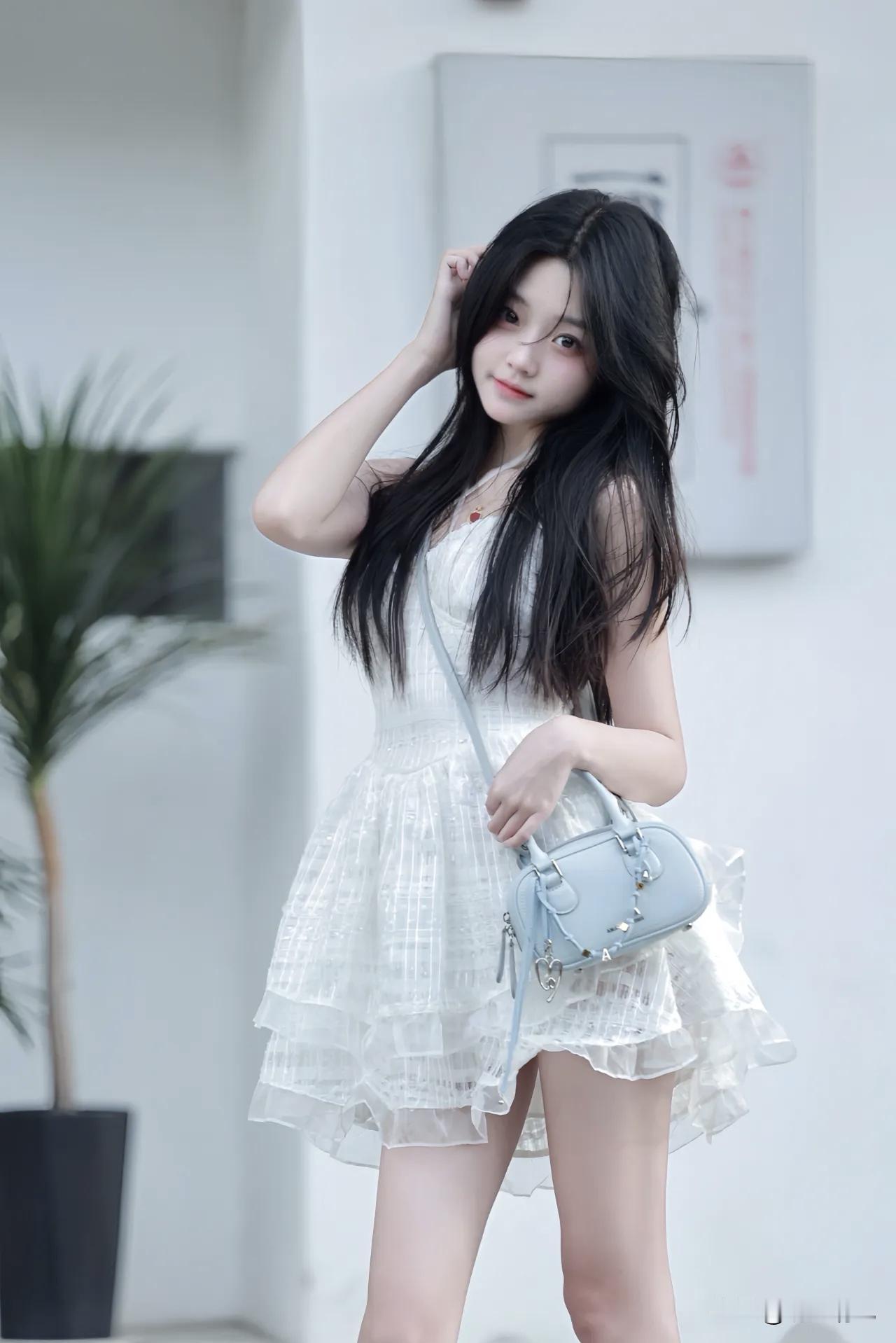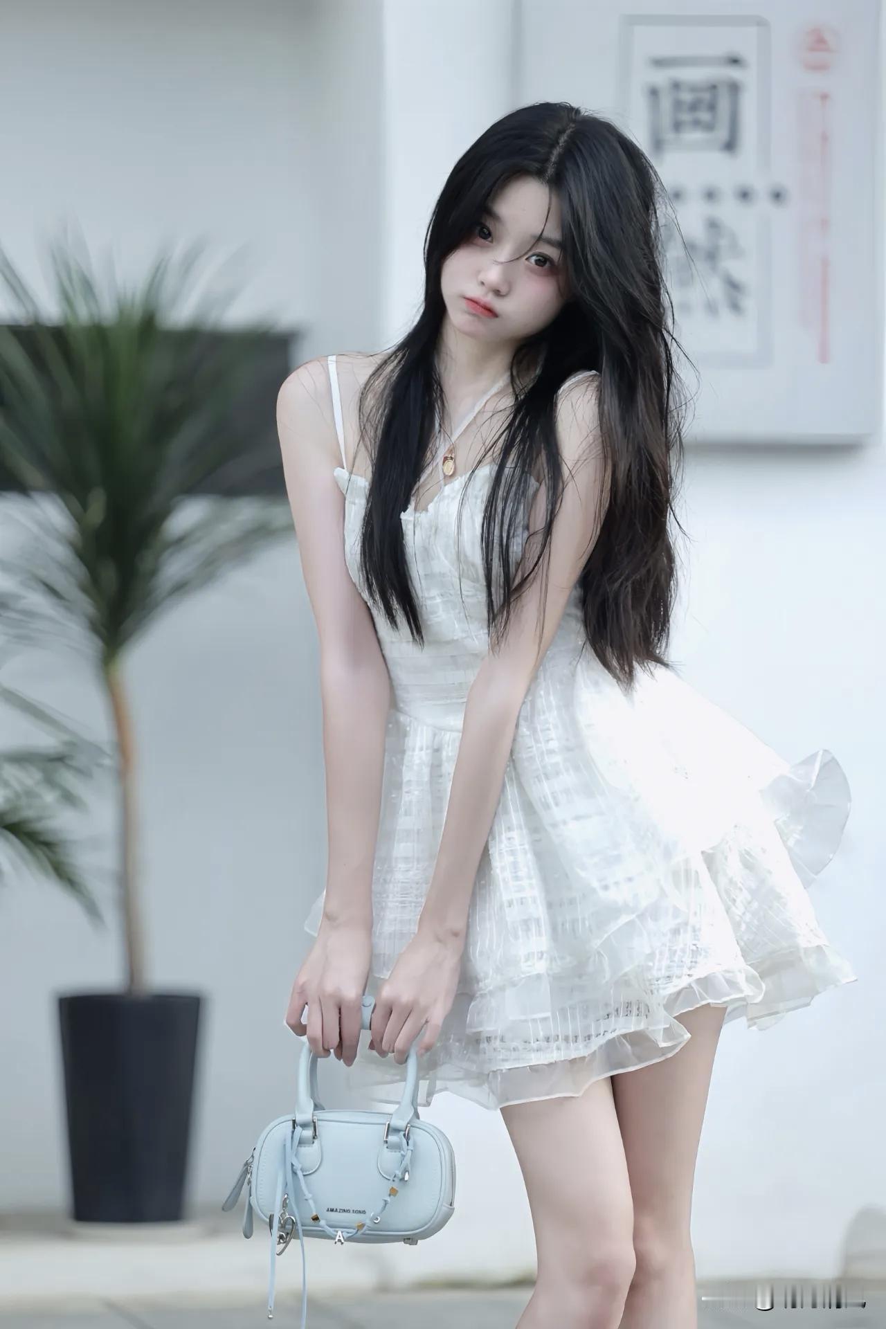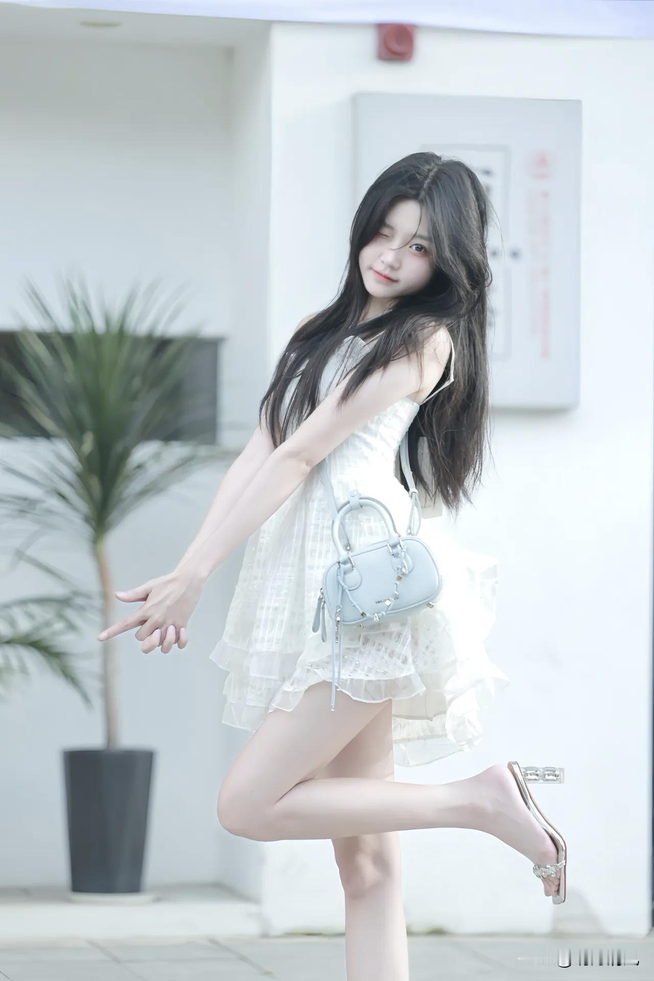 昨天拍这组的时候太阳快落山了,光线正好是最软的时候。 站白墙跟前试了好几个姿势,最后觉得最出片的反而是最简单的——就站着,把腿往后抬一下。 我身体侧过去,两只胳膊往后伸,手指自然张开,这样肩背那条线就拉出来了。浅蓝包挂在腰侧,裙摆被带起来一点点,没飘太高,刚好有点轻盈的感觉。右腿往后抬,膝盖弯着,那双透明跟的鞋就露出来了,鞋跟细细的,显得脚踝那块特别顺。 拍这张的时候摄影师让我眯一只眼做个俏皮表情,我试了下,结果自己先笑了。快门就卡在那一声笑里。 后来看片子发现,其实也不用刻意做表情,就那一瞬间最自然。腿抬起来的那一下,整个人是放松的,光线打在裙子上,透透的,确实有那种清透感。 晒图笔记大赛 时尚穿搭