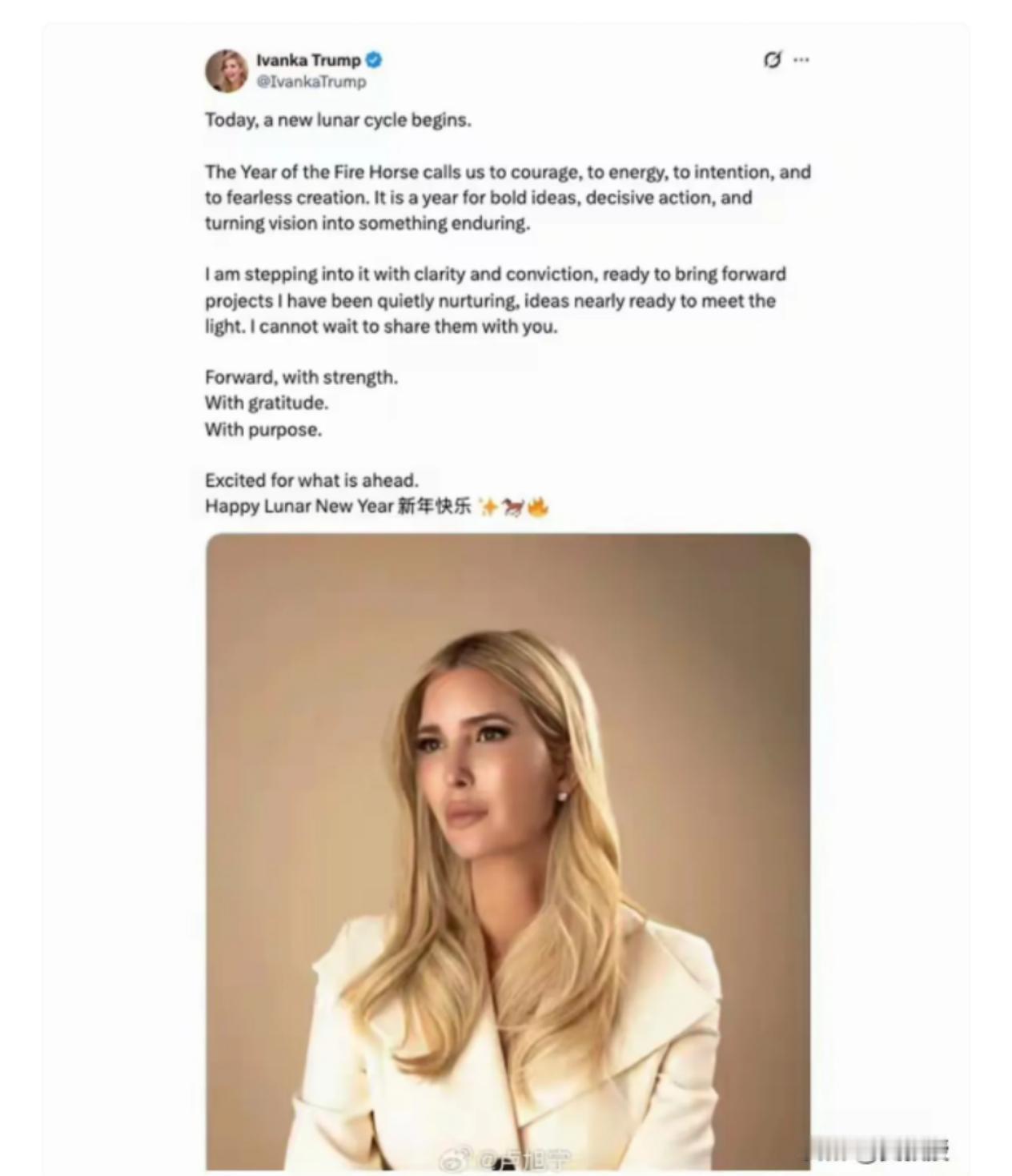 万万没想到,沉寂一年的长公主伊万卡突然在网上露面,传递出的信号很不一般?! 这次她选在春节期间更新动态,还特意送上中文新年祝福,发布后很快引来不少网友围观,互动量比她过去一年的普通动态高出不少。 之前她已经淡出公众视野很长时间,基本不碰政治相关话题,多次说重心在家庭和个人生活,这次突然发声,确实让很多人意外。 她的内容只谈节日和生活,完全避开政治,看得出来是想走温和低调的路线,不惹争议。 在我看来,伊万卡这次露面,就是借节日刷一波存在感,大概率不是重返政坛,只是为自己后面的个人发展铺路。