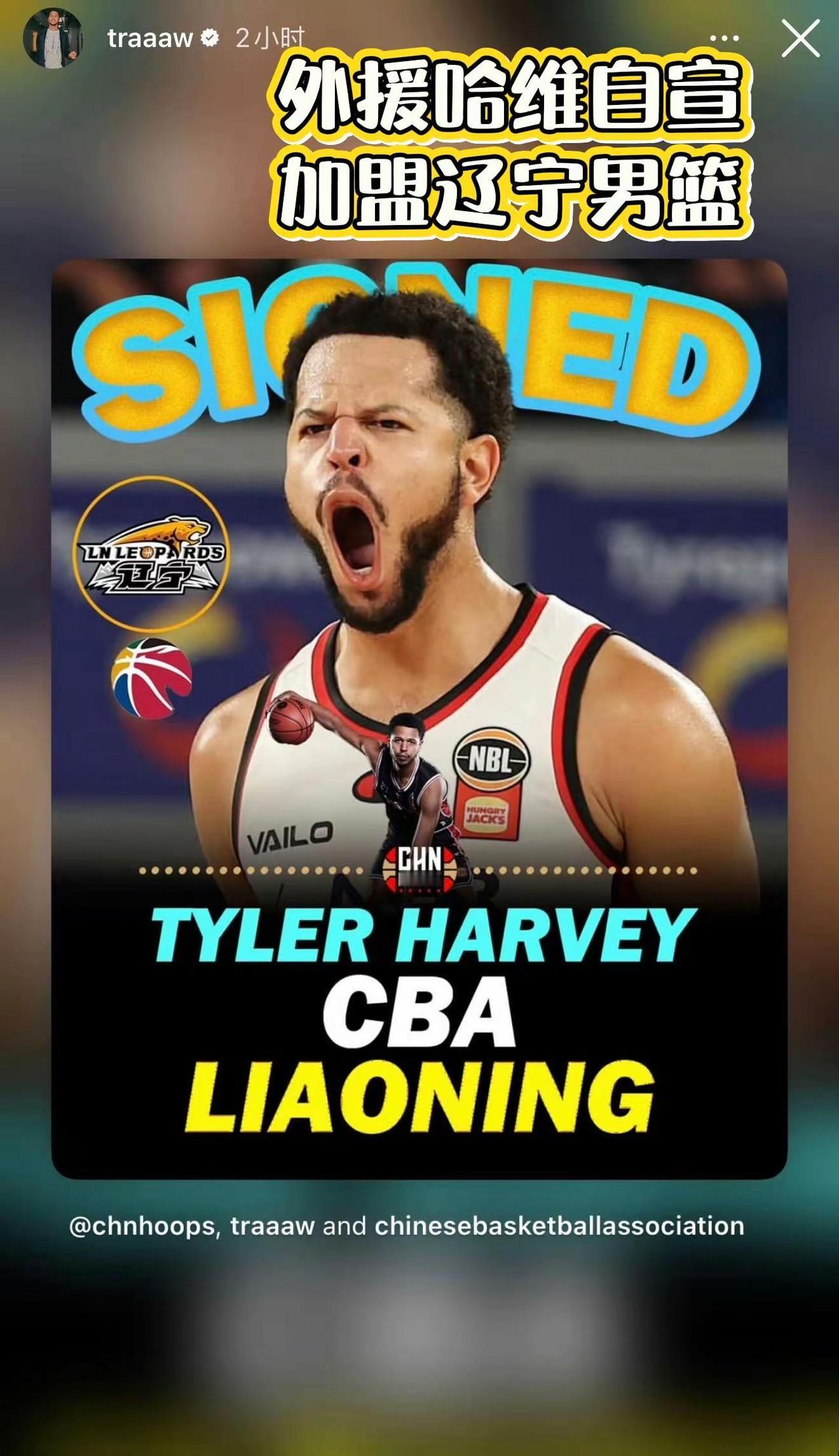辽宁男篮外援哈维迫不及待自宣:加盟辽宁队。