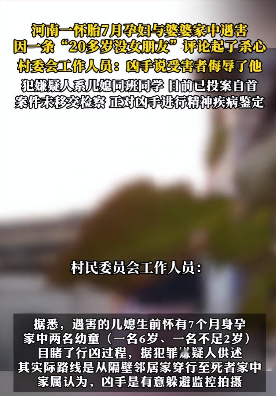 [惊喜]“必须严惩!”2025年11月,一女子见之前同学发视频,便评论了句“20多岁没女朋友”,同学觉得女子在侮辱她,竟直接闯进女子家中,将怀孕7个月的女子和她的婆婆都杀害,并且自首也并非真诚悔过!网友:简直没人性! 事发前,女子刷到了该男子发布的视频,随手在评论区留了一句调侃的话,大意是“这么些年了,你还没个女朋友”。 2025年11月30日下午5时许,阳光渐渐西斜,村子里还透着几分日常的静谧。 男子手持尖刀,眼神凶狠,闯入女子家中后,没有丝毫犹豫,对着怀有7个月身孕的女子和她的婆婆痛下杀手,手段残忍到令人发指。 更让人揪心的是,案发时,女子家中还有两名幼童,一名6岁,一名还不足2岁,他们全程目睹了这场血腥的惨案,吓得浑身瑟瑟发抖,连哭声都不敢发出,小小的身影缩在角落里,眼里满是恐惧。 行凶结束后,男子确认两人已经倒地身亡,没有停留片刻,转身就逃离了现场,只留下满地的鲜血、冰冷的尸体,以及两个吓得魂飞魄散的孩子,和一个彻底破碎的家庭。 没过多久,6岁的幼童凭着本能,颤抖着拨通了母亲的电话,向家人诉说了家中发生的惨剧,接到电话的家属,瞬间陷入崩溃,疯了一样赶往家中。 抵达现场后,眼前的一幕让所有人家属悲痛欲绝,好好的两个人,转眼间就没了气息,尤其是那个怀有身孕的女子,腹中还有一个未出世的孩子,三条生命,就这样被无情剥夺。 家属在查看现场监控时,发现了异常,监控画面里,只能看到男子退避的身影,却看不到他闯入家中的画面,结合男子后来的供述,大家才知道,他是有意躲避监控,这场行凶,从一开始就是有预谋的。 事发后不久,这名21岁男子主动向警方投案自首,如实供述了自己的犯罪事实,但他的自首,并非出于真诚的悔罪。 男子虽然有自首情节,但他的作案手段极为残忍,造成的后果特别严重,而且自首的动机,大概率是为自己预留后路,并非真心悔过。 除此之外,男子还自称患有抑郁症、躁狂症,试图以此寻求从轻处罚,但结合初步的侦办意见,他所谓的精神问题,可能仅仅是一般的性格缺陷,远没有达到可以免除刑事责任的程度。 目前,相关部门正在对男子进行精神疾病鉴定,完整的证据链,还需要等待鉴定报告来补充完善。 截至目前,这起案件依然处于公安机关的侦查阶段,而受害者家属的悲痛,却丝毫没有减轻。 他们唯一的诉求,就是判处凶手死刑、立即执行,用法律的正义,告慰死者的在天之灵,还他们一个公道。 这起案件被曝光后,很快就在网络上引发了轩然大波,网友们得知详情后,无不感到震惊和愤慨,大家纷纷留言谴责男子的恶行,直言他简直没人性。 有人说,一句随口的调侃,竟然酿成了如此惨痛的悲剧,两条人命,加上一个未出世的孩子,太令人心痛; 也有人说,性格极端从来都不是施暴的借口,哪怕受到了所谓的“侮辱”,也不能用剥夺他人生命的方式来泄愤。 生命只有一次,无论是受害者,还是那个未出世的孩子,都有权利享受这个世界的温暖,可他们的生命,却永远定格在了2025年的11月。 一句玩笑,三条人命,一个家庭破碎,两个孩子留下终身心理创伤,这场悲剧,不仅是受害者家庭的灾难,更是对整个社会的警示。 网友们的愤怒,家属们的诉求,都是对正义的渴望,我们坚信,法律不会偏袒任何一个恶人,一定会还受害者家属一个公道,一定会让凶手为自己的恶行付出惨痛的代价。 法律的底线不容触碰,生命的尊严不容践踏,任何极端的行为,都终将在正义的阳光下,无处遁形。