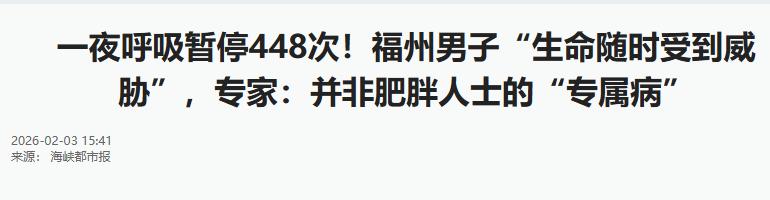 “太吓人了!”2月3日报道,福建一名女子在睡觉时被她丈夫的呼噜声吵醒之后,竟然发现自己的丈夫不喘气了,过了一分多钟之后也才开始呼吸,吓得她第二天赶紧带着她丈夫来医院检查,经过医生的睡眠监测发现,她丈夫在熟睡时竟然“断气”448次,最长的一次憋气竟然能达到115秒,网友:这打呼噜简直“索命”啊! 事发当天,夫妻俩像往常一样正常入睡,男子躺下没一会儿就发出了熟悉的呼噜声,这种声音他妻子听了很多年,早就习以为常,甚至一开始还没太在意,翻了个身就想着继续睡。可没一会儿,她就被一阵异常的安静惊醒了——原本此起彼伏的呼噜声,突然消失得无影无踪。 起初她还以为丈夫是暂时不打呼噜了,可仔细一听,连丈夫的呼吸声也没了,胸口更是一动不动。她瞬间就慌了神,下意识地凑过去摸丈夫的鼻子和脉搏,能感觉到脉搏还在跳动,可就是没有一丝呼吸的迹象。 她不敢大声喊醒丈夫,也不敢随便晃动他,只能死死盯着丈夫的脸,一秒、十秒、三十秒、六十秒,时间一点点过去,每一秒都像一个小时那么漫长,直到一分多钟后,丈夫才突然发出一声沉重的喘息,紧接着恢复了呼吸,胸口也跟着起伏起来。 那一刻,她的后背已经被冷汗浸湿,手脚都在发抖,直到确认丈夫呼吸平稳,她才敢轻轻舒了口气,但那一夜,她再也没有合过眼,眼睛死死盯着丈夫,生怕再出现一次这样的情况,就连丈夫正常的翻身,都能让她瞬间绷紧神经。 近两分钟的停顿,彻底打破了她的侥幸心理,她隐约觉得,丈夫的身体可能出现了严重的问题,这种“断气”根本不是什么睡得香,而是在和死神擦肩而过。 天刚蒙蒙亮,天还没完全亮透,她就叫醒了丈夫,把昨晚发生的事情一五一十地告诉了他,丈夫一开始还不太相信,觉得她是太紧张看错了,毕竟自己从来没有感觉到身体不舒服,白天也没有嗜睡、头晕的情况,除了打呼噜,平时吃饭、工作都很正常,怎么可能会出现不喘气的情况。 可看着妻子认真又恐惧的眼神,还有她眼角的红血丝,丈夫也意识到了事情的严重性,没有再反驳,简单洗漱完,就跟着妻子去了当地医院。 接诊的医生听完女子的描述后,没有丝毫大意,立刻就判断男子大概率是患上了阻塞性睡眠呼吸暂停综合征,这种病很多人都不了解,甚至会和普通的打呼噜混淆,但两者的区别很大,普通打呼噜只是气道狭窄导致的声音,而这种病,是睡眠时气道反复塌陷,导致呼吸暂停,长期下去,会引发高血压、冠心病,严重的甚至会在睡眠中猝死。 医生告诉他们,要确诊这种病,最关键的就是做睡眠监测,也就是让患者在医院睡一晚,通过专业的设备,监测睡眠过程中的呼吸、心率、血氧饱和度等各项指标,看看呼吸暂停的次数、每次暂停的时间,以及血氧饱和度下降的情况,这样才能准确判断病情的严重程度。 男子听从了医生的建议,当天就办理了住院手续,准备接受睡眠监测,监测的过程很简单,就是在身上贴上各种细小的传感器,连接到监测设备上,然后正常入睡就可以,这些传感器不会影响正常睡眠,却能精准记录下睡眠中的每一个细节,包括每一次呼吸、每一次鼾声,还有呼吸暂停的具体时间。 那一夜,监测设备一直处于工作状态,医生也会定时查看监测数据,而男子的妻子,依旧守在病房外,一夜未眠,心里既期待又害怕,期待监测结果是好的,害怕结果真的像医生说的那样严重。 第二天一早,监测结束后,医生就对数据进行了详细的分析,当看到分析结果时,就连经验丰富的医生,都忍不住皱起了眉头,而男子和他的妻子,在听到医生说出数据的那一刻,彻底懵了。 医生告诉他们,经过一整夜的监测,男子在睡眠中呼吸暂停的次数竟然达到了448次,平均下来,每小时就要“断气”几十次,也就是说,他几乎每一分钟都在经历一次短暂的窒息,而最长的一次憋气,达到了115秒。 期间他的血氧饱和度最低跌到了48%,而正常人的血氧饱和度应该在95%以上,长时间的缺氧,已经对他的心脏和大脑造成了潜在的损伤,只是他自己没有感觉到而已。 更让人揪心的是,医生还说,男子的情况已经属于极重度阻塞性睡眠呼吸暂停伴严重低氧血症,如果再继续拖延,不及时治疗,以后很可能会在睡眠中发生猝死,就算不猝死,也会引发一系列并发症,比如高血压、脑梗、糖尿病,甚至会影响认知功能,导致记忆力下降、反应迟钝。 后来,医生通过进一步检查,找到了男子患病的根源,原来是他睡眠时舌根会严重后坠,把喉部的气道几乎完全堵死,导致气流无法正常通过,才会出现呼吸暂停的情况,而且这种情况,并不是只有肥胖的人才会患上,男子身形匀称,却依然没能幸免。 医生根据他的具体情况,制定了个性化的治疗方案,让他佩戴改良型的口腔矫治器,通过这种矫治器,在睡眠时前移下颌骨,从而把舌根部向前牵拉,避免舌根后坠堵塞气道,从根源上解决呼吸暂停的问题。 那么,大家身边有经常打呼噜且有呼吸停顿情况的人吗?你们平时都会怎么处理?欢迎在评论区留言讨论。