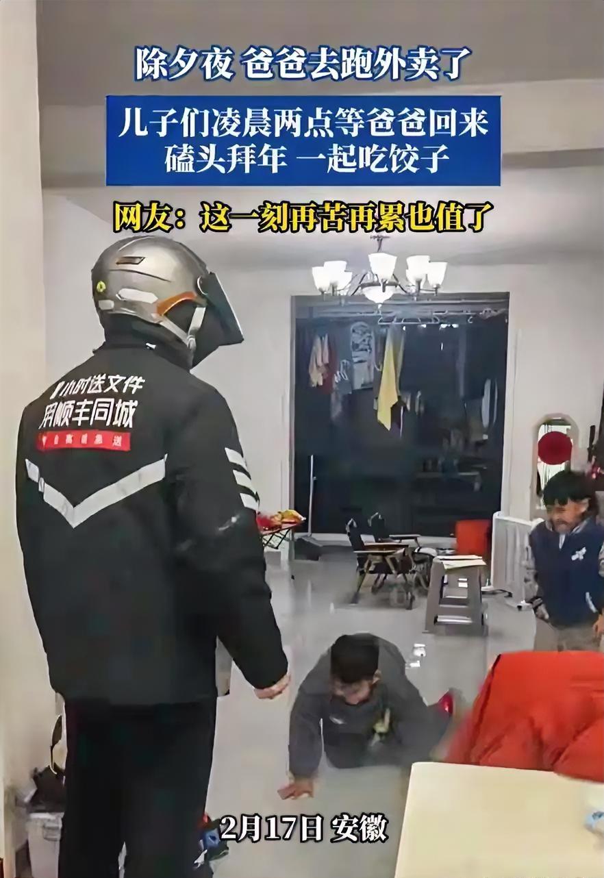 看哭了!安徽,一男子除夕夜并没有在家过年,而是为了多赚点钱出去跑外卖,凌晨2点回家时,本以为老婆和孩子都已经睡了,结果一开门,两个儿子突然跑过来磕头拜年。那一瞬间,一切辛苦都值得了 除夕夜本是万家团圆的时刻,家家户户都围坐在一起吃年夜饭、看春晚,热热闹闹迎接新年。可这位安徽的爸爸,却选择在这个最特殊的夜晚出门奔波,只为多挣一点加班费,让家人过得宽裕一点。凌晨的街头又冷又静,他骑着电动车穿梭在空荡荡的路上,心里装的全是家里的妻儿。 他出门的时候,孩子还在等着爸爸回家过年,他却只能狠下心推门离开。他想着忙到半夜回去,家人肯定早就睡熟了,自己轻手轻脚进门,不打扰他们休息就好。可他怎么也没想到,等待他的不是漆黑安静的屋子,而是两份最暖心、最纯粹的惊喜。 凌晨两点,他终于结束工作打开家门,灯光瞬间照亮了小小的客厅。两个小小的身影一下子冲了过来,扑通一声跪在地上,认认真真给爸爸磕头拜年。孩子奶声奶气喊着新年祝福的那一刻,这个在外打拼的硬汉,瞬间就破防了。 视频里能清楚看到,男人愣在门口,手里还拎着外卖箱,整个人都僵住了。前一秒还带着奔波的疲惫,下一秒眼圈就红了,嘴角却忍不住往上扬。那是藏不住的感动,也是所有辛苦被瞬间治愈的模样。 为了生活,他放弃了团圆,选择在除夕夜负重前行。风吹在脸上是冷的,电动车骑久了手脚是麻的,遇到难搞的订单心里也会委屈。可在看到孩子磕头的那一刻,所有的疲惫、心酸、劳累,全都烟消云散。 很多成年人看了这段视频都忍不住落泪,因为大家都在他身上看到了自己的影子。我们拼命工作、早出晚归、忍气吞声,不是为了自己,而是为了身后的家人。为了孩子能吃饱穿暖,为了家里能多一份安稳,再苦再累都愿意扛。 孩子或许不懂爸爸为什么除夕夜不陪自己,不懂成年人的生活有多难。但他们知道,爸爸在外奔波是为了这个家,他们用最朴素的磕头拜年,表达对爸爸的爱。这种不用教的懂事,最戳人心,也最让人心疼。 妻子也一直没睡,默默等着丈夫回家,还悄悄拍下了这温暖的一幕。一个在外拼命赚钱,一个在家守着温暖等候,两个人一起撑起这个普通又幸福的小家。没有大富大贵,没有惊天动地,却有着最珍贵的烟火温情。 现在很多人总喜欢追求光鲜亮丽的生活,觉得有钱有势才是幸福。可这个深夜回家的外卖员告诉我们,幸福从来都和金钱无关。幸福是有人等你回家,是有人懂你辛苦,是孩子天真纯粹的爱。 他一晚上跑单挣的钱,或许不够买一件贵重的礼物,不够吃一顿豪华的年夜饭。但孩子这一跪,一句祝福,却是千金都换不来的宝藏。这是一个父亲最骄傲的时刻,也是一个男人奋斗最大的意义。 生活从来都不容易,每个在外打拼的成年人,都在默默扛着生活的重量。可只要一想到家里的灯光,想到等待自己的家人,就觉得一切都值得。这就是普通人最动人的坚强,也是最平凡的伟大。 这个没有山珍海味、没有热闹排场的除夕夜,反而比很多奢华的新年更让人难忘。它让我们明白,最好的年味,不是鞭炮和红包,而是家人闲坐,灯火可亲,彼此牵挂。在外风雨兼程,回家被爱包围,这就是普通人最踏实的幸福。 各位读者你们怎么看?欢迎在评论区讨论。