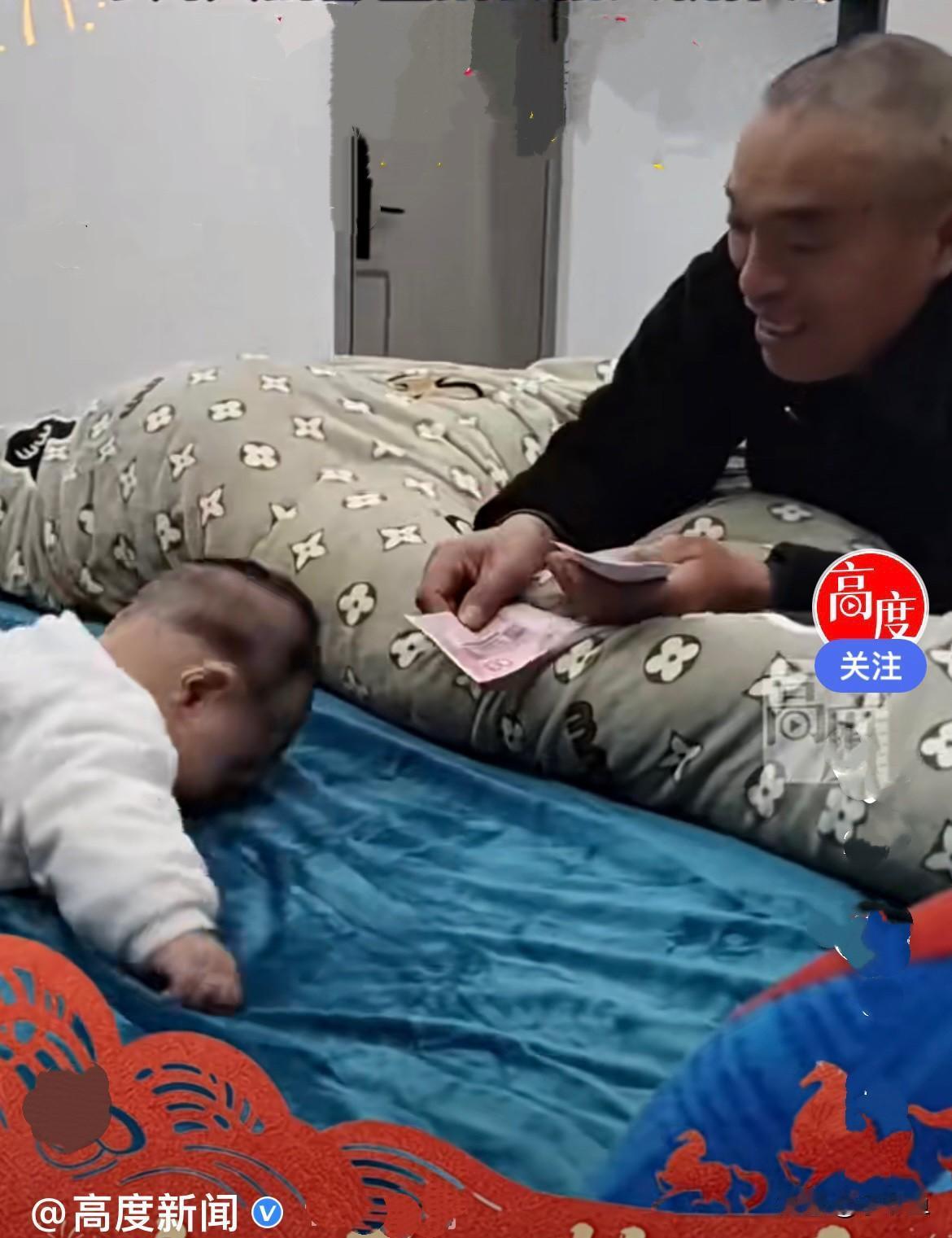 过年了,河南周口一小孙子刚满5个月,头刚会抬起来,小孙子在床上趴着,头抬一会儿不会支撑太长的时间,头抬一会儿就得低头,就像磕头拜年一样,这把爷爷乐的,赶紧拿出压岁钱,小孙子每低一次头,爷爷就给100压岁钱,乐此不疲…… 爷爷是真高兴啊,后辈有人啊,隔辈亲啊……