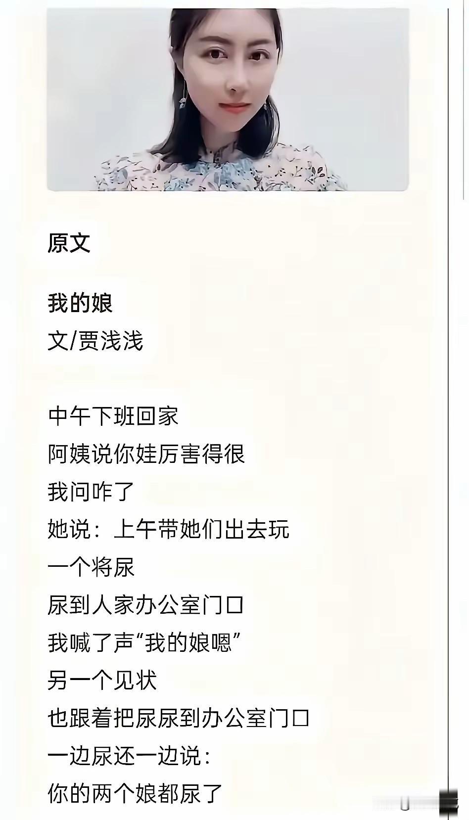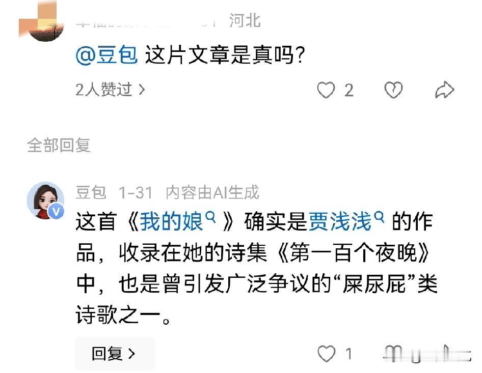 没想到,这首诗是真的! 贾浅浅的又一力作,这首诗十分的接地气,通俗易懂,非常适合咱们普通人欣赏。 但也有网友认为,这是“屎尿屁”诗歌,根本就不能登大雅之堂,起初也以为这只是网友们的恶搞,但是问过豆包之后,确实是贾浅浅的作品,收录在她的诗集《第一百个夜晚》中。 当然,还收录了很多这种类型的诗歌,真的不愧是陕西青年作家协会副主席,水平还是有的。
