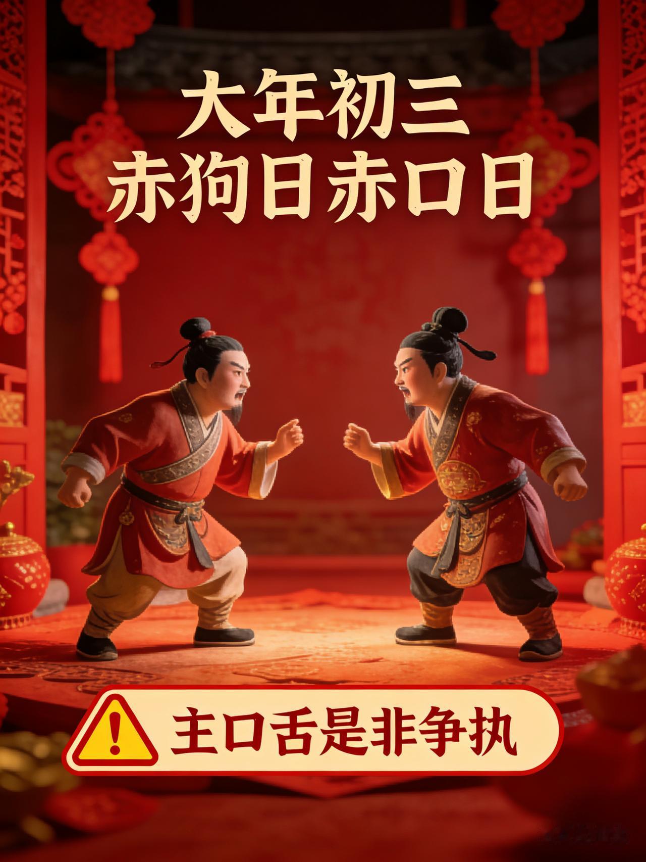 为什么古人劝你大年初三“别出门”?不是迷信,是看透人性的大智慧 大年初三,长辈总念叨:别出门、别拜年、别串门。年轻人听了只当是老迷信,可千百年传下来的规矩,从不是凭空吓唬人,而是藏着最懂中国人情、最护自家平安的大智慧。 民间把初三叫赤狗日、赤口日。赤狗是传说中的“熛怒之神”,主口舌、是非、争执。古人觉得,这天出门,最容易一言不合闹别扭,拜年拜出怨气,串门串出矛盾。好好的年,别因为几句闲话,毁了一整年的和气。 初一忙拜年,初二忙回门,连续两天连轴转,喝酒、应酬、赶场,身体早就累到临界点。初三不出门,根本不是忌讳,是强制休息。老话说“初一早,初二早,初三睡到饱”,就是让你卸下疲惫,养足精神,这才是对自己最好的开年。 更深层的道理,是守住人心。春节热闹过头,人情压力也跟着来。问工资、催婚、比孩子,句句扎心。初三闭门不出,是给彼此留余地:不勉强社交,不刻意讨好,不参与是非,嘴巴闭紧,福气才留得住。 所谓“赤口”,不是怕凶神,是怕人心浮躁。不出门,不是胆小,是懂退让、知分寸。 今天不必死守老规矩,但这份智慧值得记牢:少去是非场,多陪家里人;不惹闲气,不生争执。安安静静待一天,心稳了,这一年才能顺顺当当、福气满满。 新的一年,愿你远离是非,平安喜乐,所求皆如愿,所行皆坦途! 大年初三几点起 大年初三拜年语 正月初四的讲究 大年初三去做客 农村初二的习俗 初三去拜年 冬月初三谚语