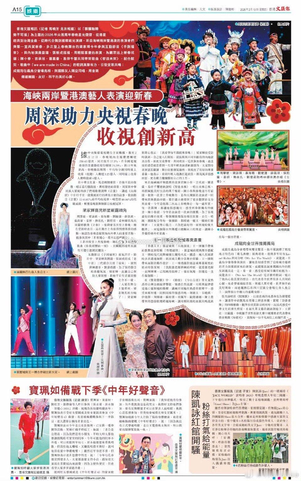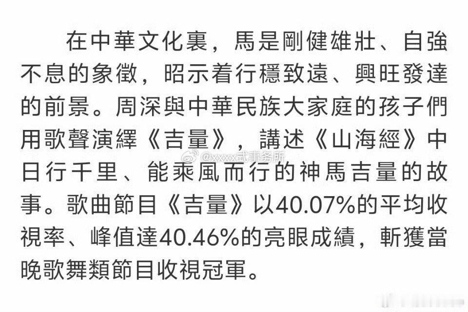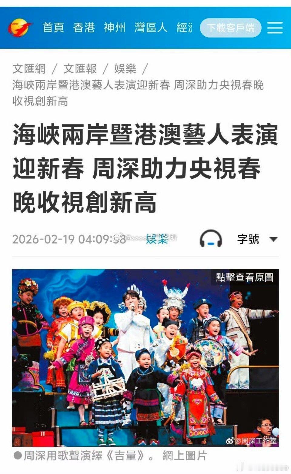 香港文汇报报道了周深《吉量》获2026马年春晚收视冠军的消息,唯一一个收视率破40的节目