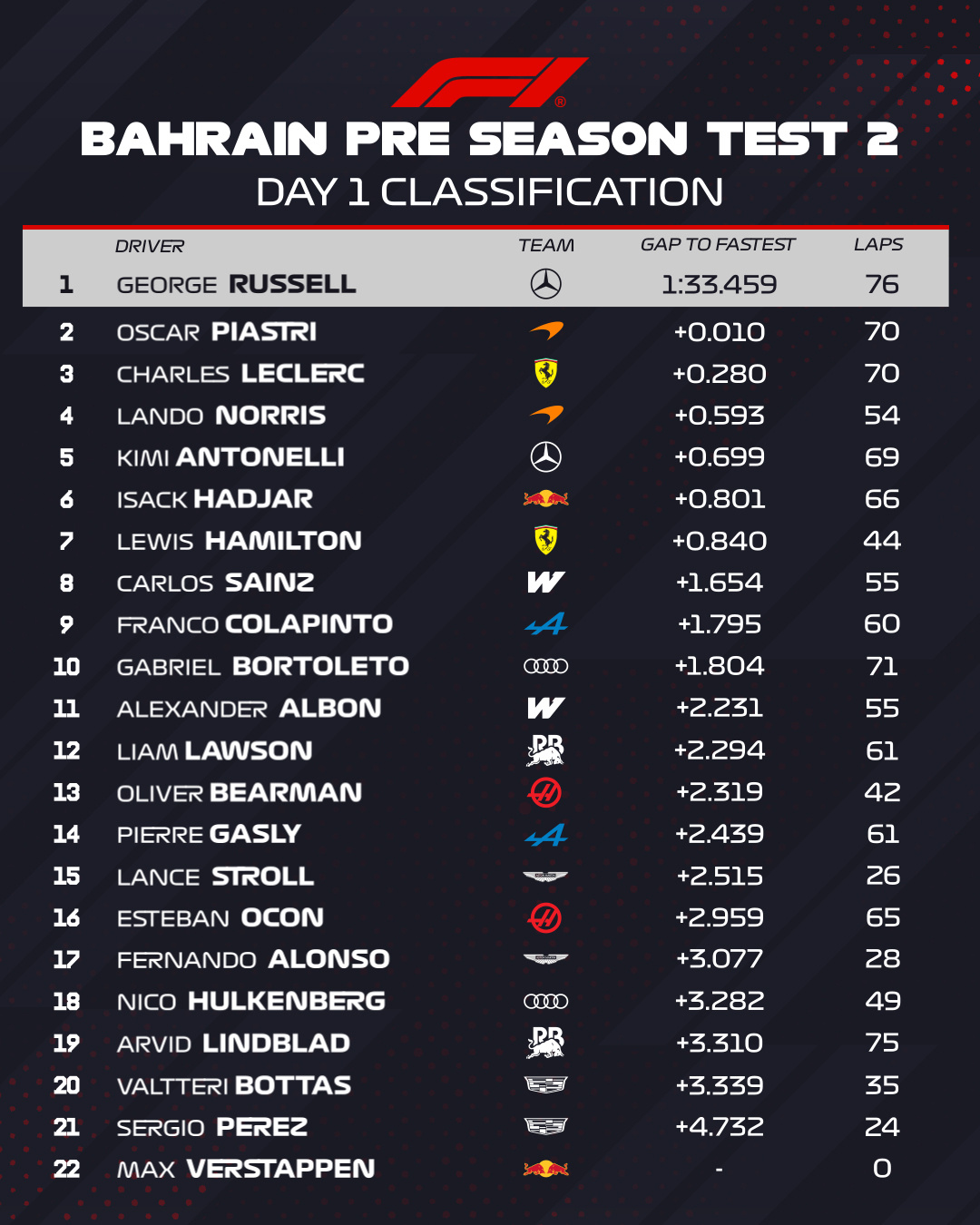 F1巴林季前测试第二轮第一天的最快圈速榜以及各车手的完成圈数。
