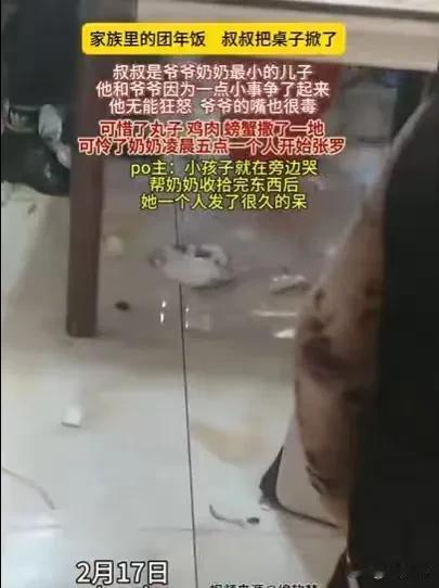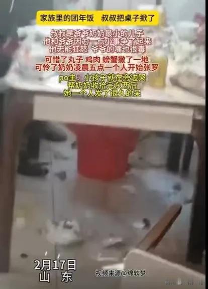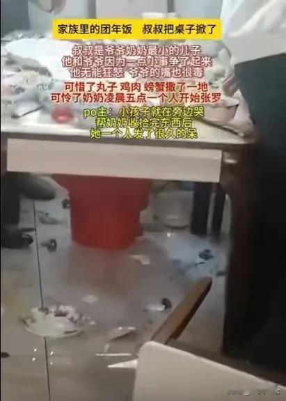 山东,过年了,奶奶凌晨5点就起来张罗,做了一桌的团圆菜,爷爷和叔叔却因为一件小事吵了起来,叔叔无能狂怒,爷爷嘴又毒,最后叔叔一气之下, 把满桌的团圆菜掀翻了。 清晨5点,奶奶就已经起床了,她要张罗团圆饭了,她一想到,一大家子人,要坐在一起吃团圆饭,她就非常的期待,大家忙忙碌碌一年,她期盼了一年,就等待过年这天,一家人能够团团圆圆的,能够开开心心的。 为了能够让一大家子人,吃一顿饱饱的得团圆饭,奶奶准备了很多的菜,有自己做的丸子,有买的螃蟹,有鸡肉,各种各样的菜,在奶奶的一顿张罗下,变成了满桌的佳肴。 过年,最爱的是妈妈的味道,是奶奶的味道,看着满满一桌菜,奶奶赶紧招呼一大家子人来吃饭。 大家纷纷落座,一大张圆桌,大家团团地坐着,奶奶看大家团团圆圆的样子,她一年的期盼,值得了,她就想和大家开开心心地吃一顿团圆饭。 但一家人最担心的事情还是发生了,奶奶的眉头皱起来了。 一家人的目光都焦聚在爷爷和叔叔身上。 他们俩因为一件事情吵了起来,若是平时,他们俩因为小事吵起来,一家人也就习以为常了,可现在是吃团圆饭,大家担心,这团圆饭吃不成。 只见爷爷嘴毒,一个劲地数落叔叔,在大家看来,叔叔是有些无能,他听着爷爷的数落,两人谁也不服。 他们吵着吵着,一桌团圆菜,就被狂怒的叔叔,一把掀翻,瞬间,满地的狼藉告诉大家,叔叔不开心,这团圆饭大家也别想吃了。 突如其来的画风转变,吓坏了在场的孩子,孩子看着狂怒的叔叔,在愤怒,看着嘴毒的爷爷,在唠叨,孩子哭了,闹着要回家,温馨的画面变成了你吵我闹,谁也不服谁。 好好的团圆饭,就在叔叔无能狂怒之下,变成一地狼藉,他的这一怒,让一家人都不知道如何收场。 可怜了奶奶,凌晨5点起来张罗团圆饭,现在象征团团圆圆的丸子,滚落在地上,就如同他们现在的这个大家族,吃不成这顿团圆饭了。 那一地的饭菜,每一道菜,都是奶奶精心制作的,鸡肉,螃蟹,青菜,各种象征美好的菜,在他们的这个家里,都只能落到地上。 一家人只能在爷爷的嘴毒下,在叔叔的狂怒下,默默地打扫一地的狼藉,奶奶看着嘴里不饶人的丈夫,看着愤怒的小儿子,她默默地坐在那里发呆,没人知道她的内心有多么的失落。 好好的一桌团圆饭,却让一家人看到了他们家族的不堪。 或许是因为爷爷嘴太毒了,知道小儿子无能,知道小儿子所有的事情,他最能知道,说什么话最能伤儿子。 新的一年,是对旧的一年的反思,在爷爷看来,他要数落小儿子的不是,似乎说出伤小儿子的话,小儿子就能有出息,就能成为他的骄傲,就能让他满足内心所有的不平衡。 他不知道,因为他的嘴毒,让叔叔更加愤怒。 叔叔或许确实没有别人那么有出息,在家人看来也确实有那么点无能,所以脾气也就变得暴躁了些。 当自己的痛处,被父亲戳到,他自然狂怒,好好的一顿团圆饭,就这样被毁了。 看到这样一桌团圆饭,就这样被毁,很多人感慨万分。 奶奶如此辛苦做的这桌团圆饭,她不过是想盼来一家人团团圆圆的开心。 但因为她小儿子确实没有什么出息,所以听不得父亲对他的数落,最终只能无能掀翻桌子,反抗父亲。 父亲最知小儿子的一切,他没有让一家人好好地吃团圆饭,而是在这个最显示他威望的时候,数落自己的儿子,这才造成儿子掀翻桌子的局面。 这样的局面肯定是奶奶不想见到的,也是一家人不想见到的,可事实还是发生了。 发生这样的事情,肯定是不利于家风建设的。 《民法典》第1043条规定:家庭应当树立优良家风,弘扬家庭美德,重视家庭文明建设。夫妻应当互相忠实,互相尊重,互相关爱;家庭成员间应当敬老爱幼,互相帮助,维护平等、和睦、文明的婚姻家庭关系。 一家人忙忙碌碌,奔波了一年,不管大家有没有钱?有没有出息?其实都期待着团圆的这一刻,这一刻可以聊聊开心的事情,至于那些不愉快的,可以在团圆饭之后,再好好沟通,一家人努力改进,这才是过年的意义。 那么你对他们的事情有何看法呢?