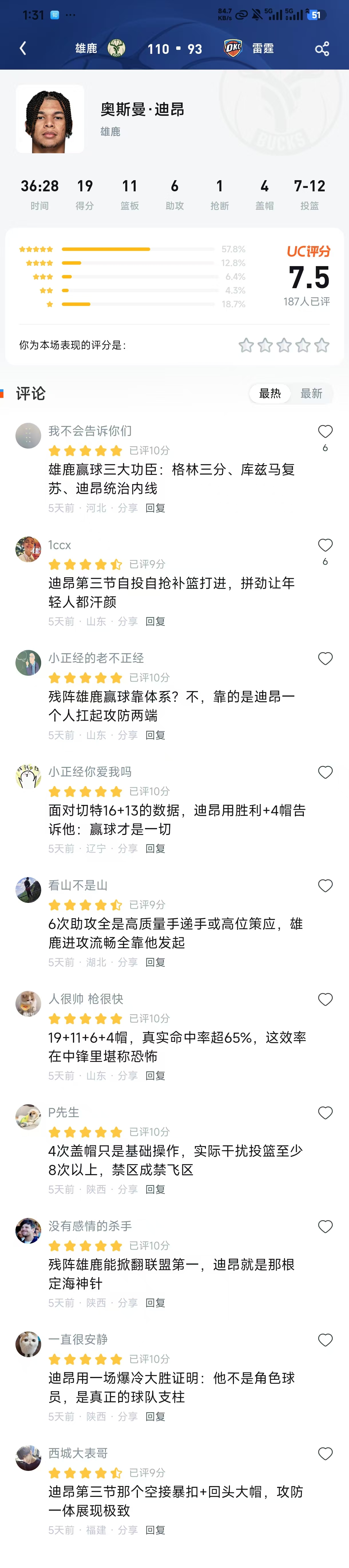 精选评论区:球迷的眼睛是雪亮的 我不会告诉你们(已评10分)👍6 雄鹿赢球三大功臣:格林三分、库兹马复苏、迪昂统治内线 (点评:精准概括了本场雄鹿的取胜之匙,迪昂的“统治力”是基石。)