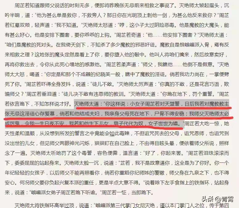 倚天屠龙记最恶毒之人:不是奸邪反派,而是这位名门正派的掌门人 说起《倚天屠龙记》里的恶人,很多人第一反应会想到朱长龄、朱九真的恩将仇报,想到简捷、薛公远忘恩负义要吃张无忌,想到成昆的阴险算计。这些人固然可恨,却都算不上全书最阴毒、最令人发指的角色。 真正把“恶毒”藏在正道光环之下,以正义之名行残暴之事,毁人一生、乱人心性、断人幸福的,是峨眉派第三代掌门——灭绝师太。 她一生高举“除魔卫道”的大旗,手握倚天剑,自视名门正派,所作所为却比魔教中人更冷酷、更偏执、更不留余地。 一、杀徒如斩草,一掌断送纪晓芙一生 纪晓芙本是灭绝最看重的弟子之一,容貌、品性、武功皆是上佳,早已与武当六侠殷梨亭定下婚约。只因遇上杨逍,动了真情,生下女儿杨不悔,便成了师父眼中的叛徒、败类。 灭绝得知真相后,没有半分师徒情分,反而生出一个阴狠计划: 逼纪晓芙去刺杀杨逍。 她明明知道纪晓芙对杨逍是真心,却要用最残忍的方式,逼徒弟亲手毁掉自己的爱人与人生。纪晓芙宁死不从,只回了一句: “弟子不能。” 灭绝没有半分犹豫,一掌将其击毙。 一条鲜活的生命、自己悉心培养的爱徒,说杀就杀。杀完之后,她面不改色,仿佛只是捏死一只蝼蚁。 最可怕的不是杀人,是杀人之后毫无愧疚,反倒自认替天行道。 二、倚剑乱杀,视人命如草芥 六大门派围攻光明顶,灭绝师太手持倚天剑,如入无人之境。 明教教众固然被她视为“魔教妖孽”,可其中不乏手无缚鸡之力的普通教众,她却杀得兴起,剑下亡魂无数,连身边弟子都心生不忍。 少年张无忌看不下去,挺身而出,求她停手。 灭绝放话:你接我三掌,我便放人。 她出手毫不留情,掌掌致命,张无忌硬受两掌,已是口吐鲜血、重伤垂危。 若不是殷野王及时赶到,张无忌便会惨死在她掌下。 在灭绝眼里,人命不重要,胜负不重要,唯有她心中的“正邪”二字最重要。谁不顺她意,谁就是该死。 三、恩将仇报,用最毒誓言毁掉周芷若 张无忌于灭绝,有两次再造之恩。 第一次,光明顶上,张无忌以一己之力化解六大门派与明教的血战,保全了峨眉众人; 第二次,万安寺中,六大门派中了十香软筋散,沦为阶下囚,是张无忌冒死盗取解药,将众人一一救下,又以乾坤大挪移从火海中接住众人。 可灭绝师太呢? 半点恩情不记,反倒把张无忌当成不共戴天的魔头。 她临死前最恶毒的一步,是彻底毁掉周芷若。 她逼周芷若对天起誓: 若对张无忌动心,若与他成婚, 父母尸骨不安, 师父化为厉鬼日夜纠缠, 生下儿女,男子代代为奴,女子世世为娼。 这誓言,毒到骨子里, 诅咒的不是一时错念,而是一生、一世、一代又一代。 她一面不许周芷若爱张无忌,一面又逼她: 用美色迷惑张无忌,骗取屠龙刀与倚天剑,夺取里面的武功秘籍。 多么讽刺: 不许动情,却要以色诱人; 不许接近魔教,却要利用魔教教主完成野心。 灭绝师太用最极端、最扭曲的方式,把一个原本温柔善良的姑娘,硬生生逼成了心机深沉、双手染血的复仇者。 周芷若后来的黑化、阴狠、算计,源头都在灭绝这一掌、一剑、一句毒誓。 四、她的恶,是“正道”之恶,最伤人也最无解 朱长龄、成昆等人的恶,是明面上的坏,人人唾骂,人人防备。 可灭绝师太的恶,披着名门正派、侠义道德、师门教诲的外衣。 她从不觉得自己恶毒,反而觉得自己最正义、最刚烈、最无私。 这种自以为是的正义,比纯粹的奸邪更可怕。 她可以杀徒弟、屠教众、逼发誓、毁一生, 却永远站在道德高地上,从不自省,从不悔改。 万安寺火海中,张无忌伸手救她,她宁可摔死,也不肯受“魔教小子”的恩惠。 刚烈吗?是。 可敬吗?一点也不。 那是偏执到疯狂的顽固,是至死不悟的狭隘。 《倚天屠龙记》写尽江湖正邪,却最讽刺地告诉读者: 最可怕的从不是魔教,而是打着正道旗号,肆意伤人、毁人、杀人的偏执狂。 灭绝师太一生杀过人、负过人、毁过人, 她对得起峨眉,对得起“正邪”二字, 唯独对不起人性,对不起良心,对不起那些因她而死、因她而苦的人。 若问全书谁最恶毒, 不是奸邪,不是小人, 正是这位—— 一身正气、满手血腥的灭绝师太。 倚天屠龙记 倚天屠龙解析 怀旧倚天