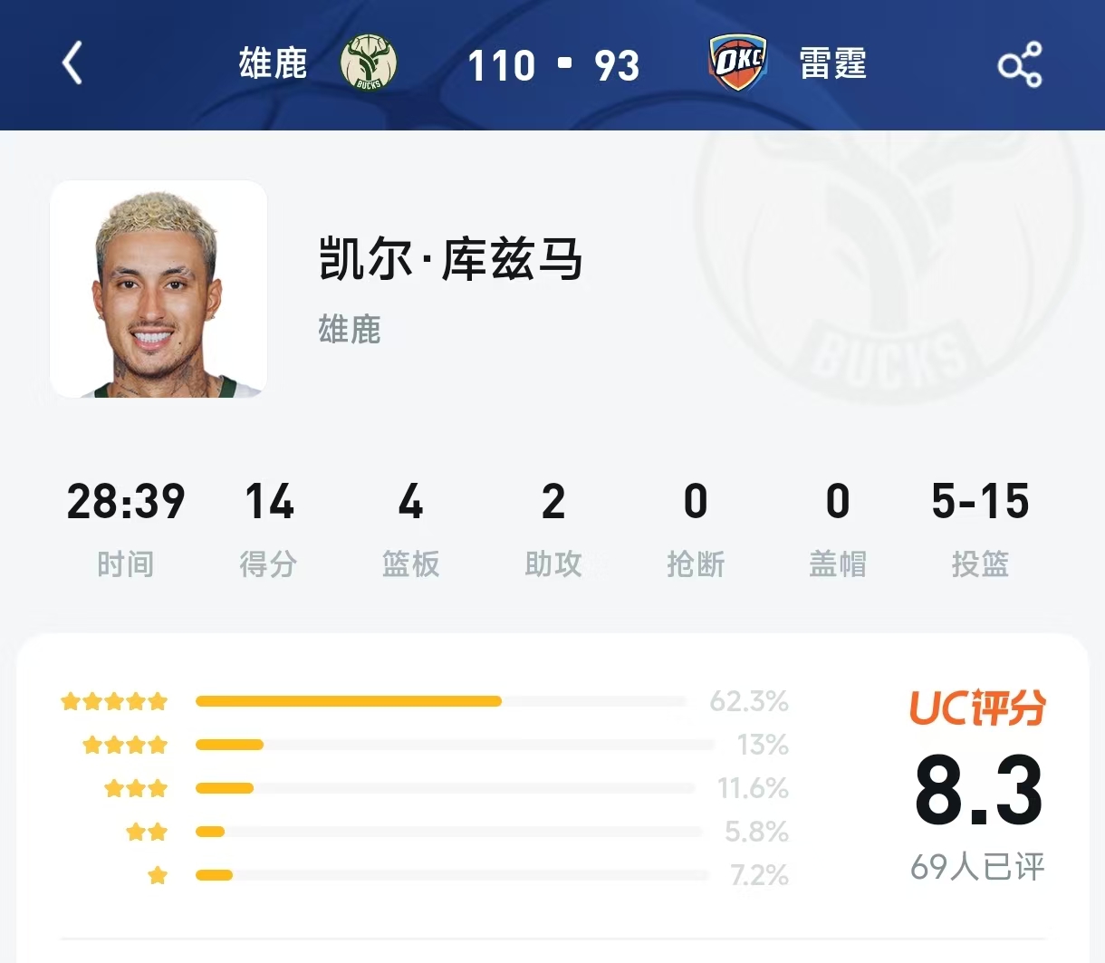🎮 比赛战报:雄鹿 110 - 93 雷霆