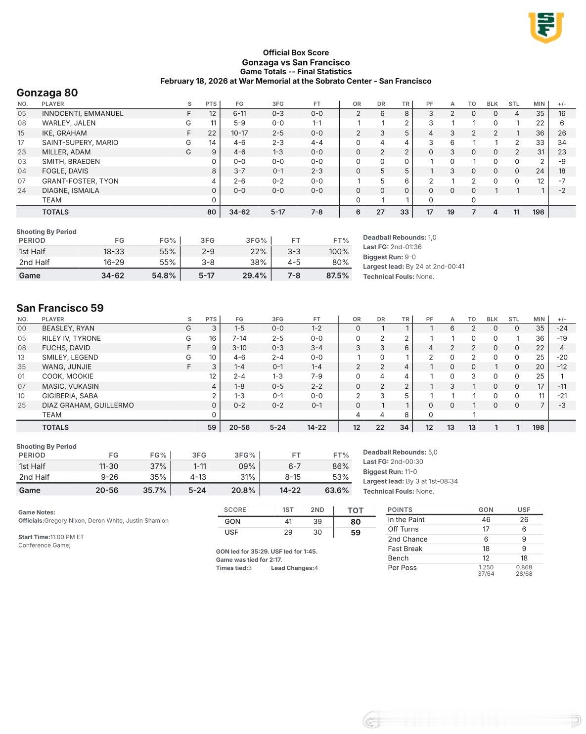 旧金山59比80不敌冈扎加,王俊杰出场20分钟得到3分4板王俊杰NCAA