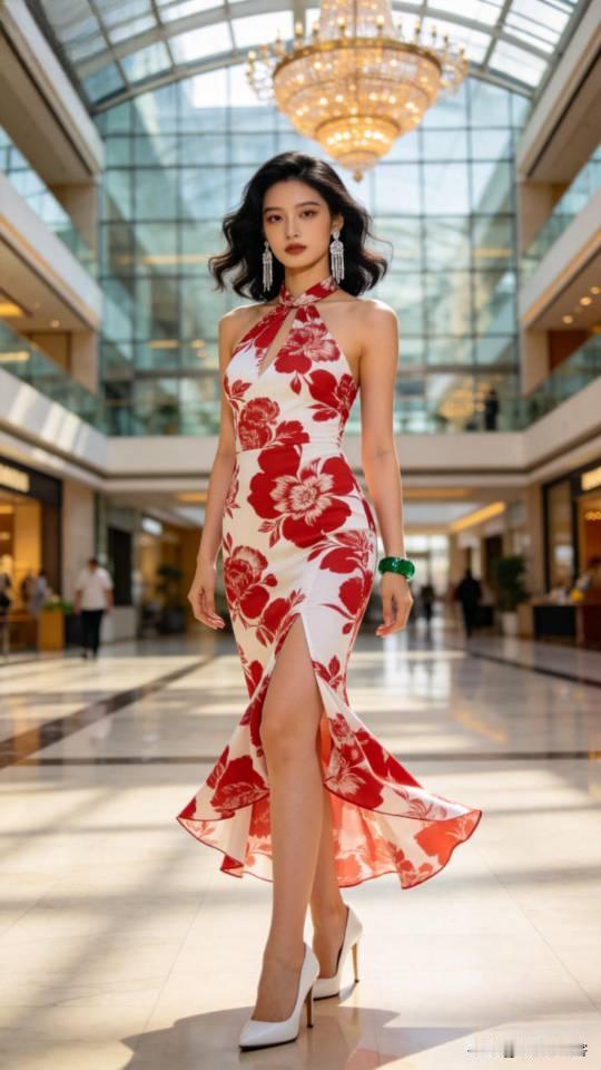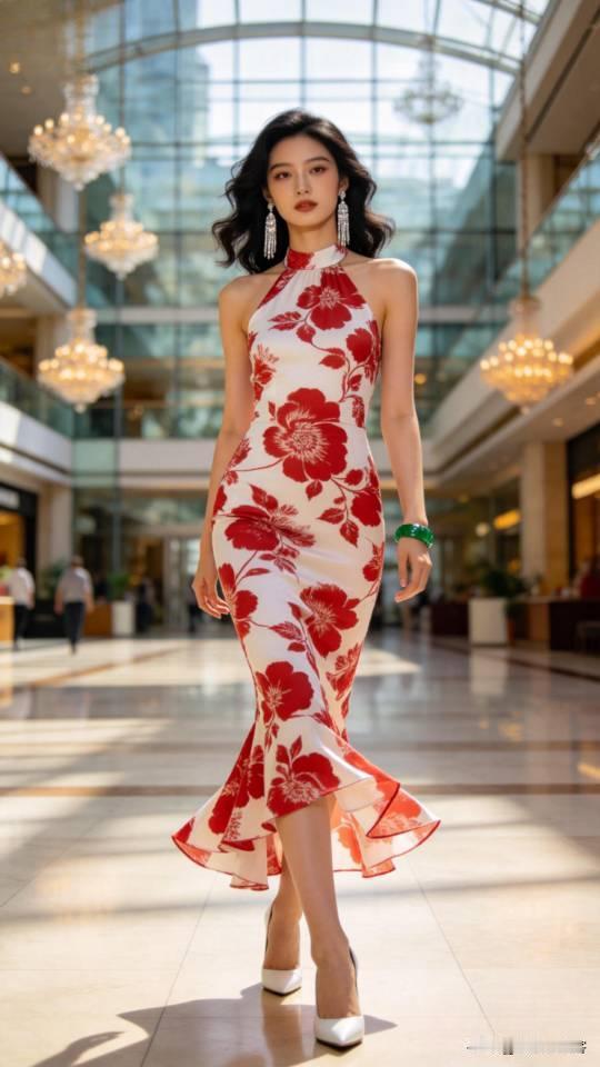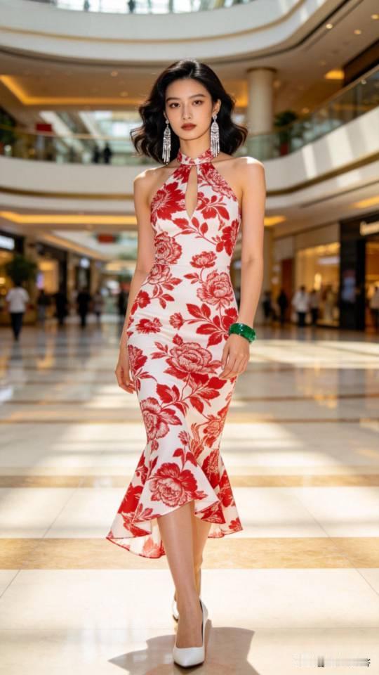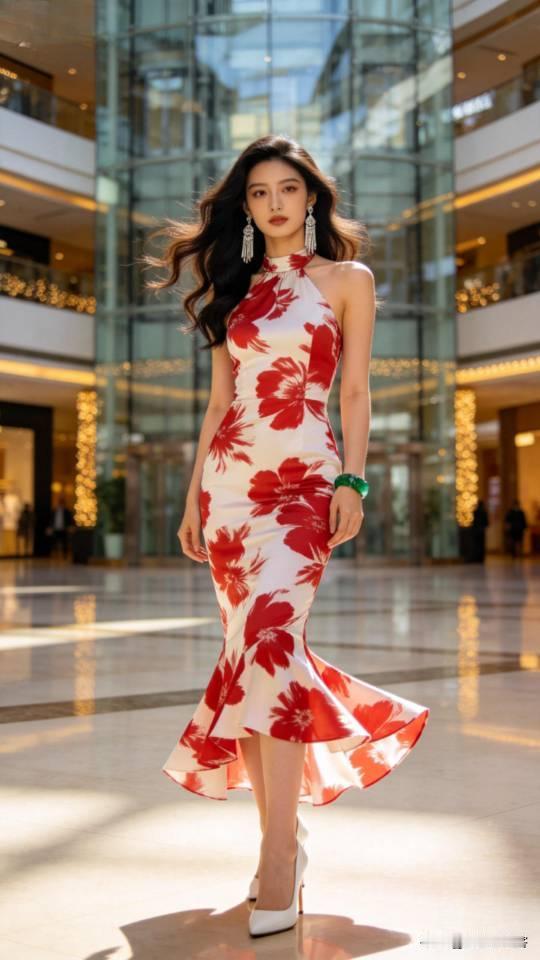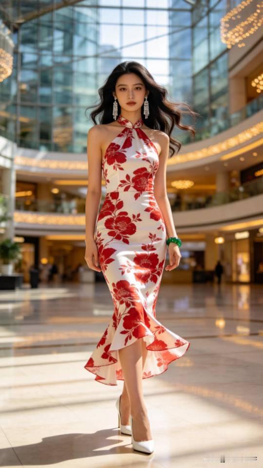 美女展示多种式样的挂脖连衣裙。无袖挂脖裙装 时尚挂脖连衣裙 时尚挂脖长裙