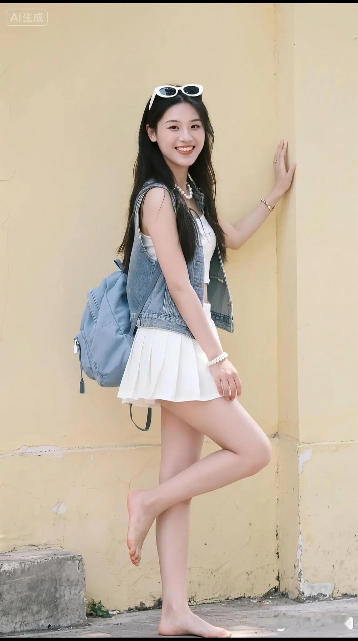 光脚走在夏末的风里🌿 这感觉,特别松弛,都不用特意摆姿势。 牛仔马甲配白吊带,百褶裙刚过膝盖,斜背个双肩包,鞋都不穿了,直接光脚踩在发烫的水泥地上,让风从脚踝一直吹到发梢。 墨镜架在头顶,珍珠项链和手链添了点甜。一笑,黄墙都亮堂了几分。 赤脚走
