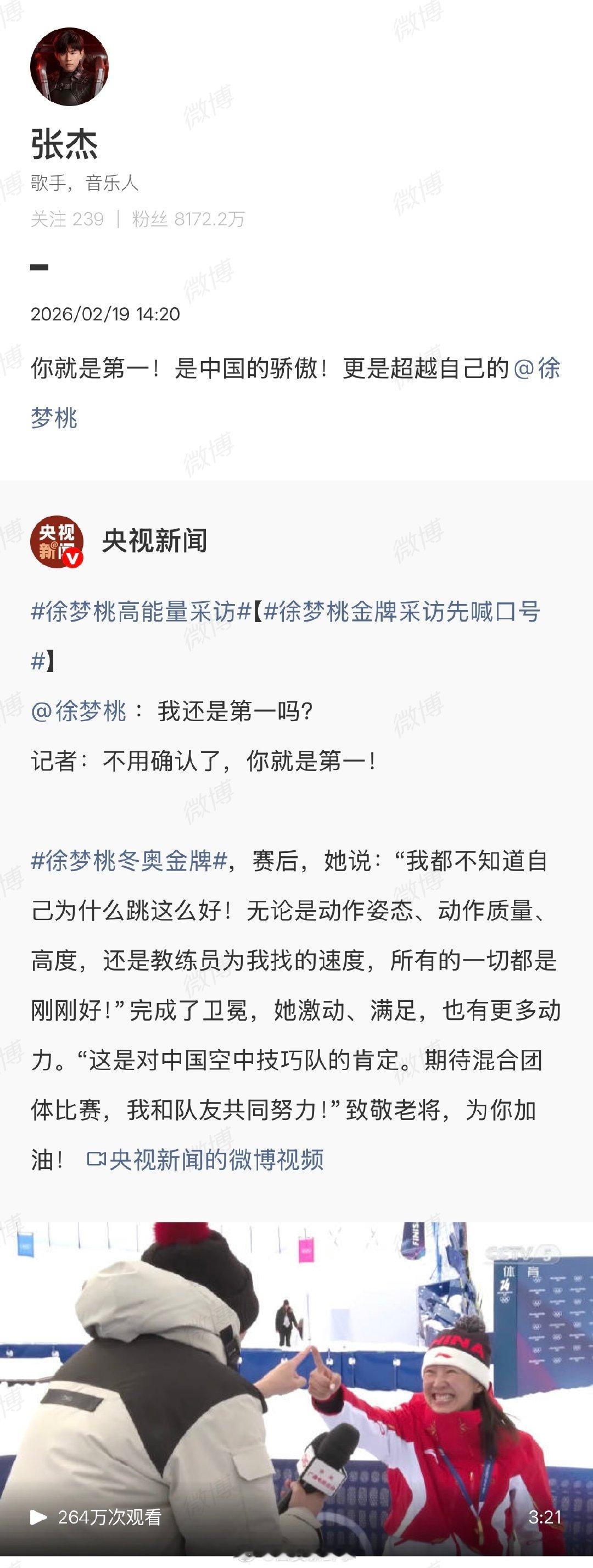 2月19日,转发央视新闻采访并祝贺徐梦桃:你就是第一!是中国的骄傲!更是超越自己的。 徐梦桃回复黄奕了