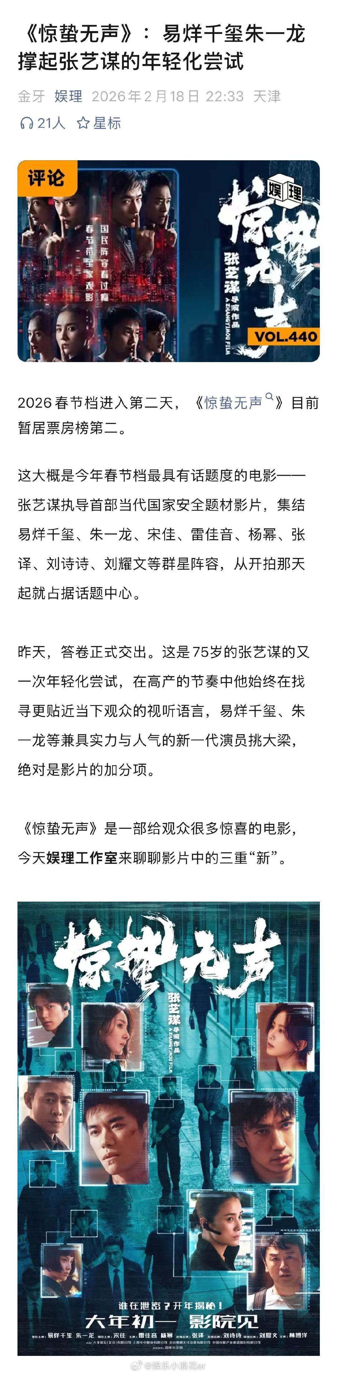 易烊千玺朱一龙撑起了惊蛰无声 75岁张艺谋正是创新的年纪 张艺谋用凌厉的节奏和高效的叙事首先把观众引入当代谍战的情境,《惊蛰无声》呈现的是与当下生活密切相关的谍战故事,间谍接头可能就藏在一次闪送中,你以为的偶遇可能就是精心设计投其所好的美人计。易烊千玺和朱一龙是影片的戏眼,无间道式的对弈和生死决战成为第一重看点…娱理独家↓