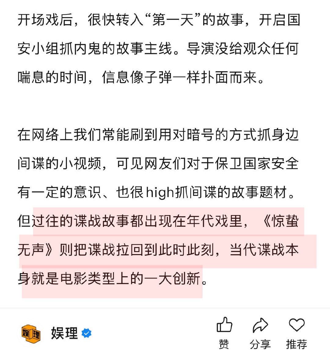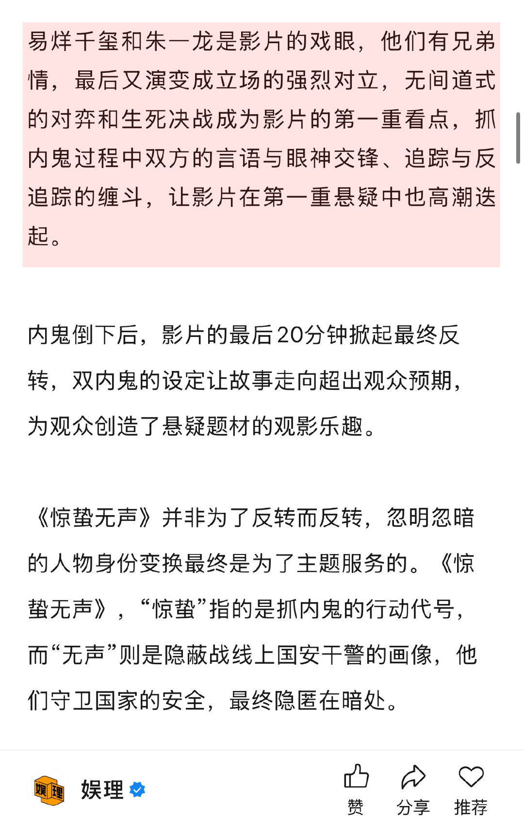 易烊千玺朱一龙撑起了惊蛰无声 75岁张艺谋正是创新的年纪 《惊蛰无声》中,一句“师哥”高效地交代易烊千玺与朱一龙之间的人物关系,为后续纠葛埋下伏笔。开场戏后,很快就开启了国安小组抓内鬼的故事主线。导演没给观众任何喘息的时间,信息像子弹一样扑面而来…当代谍战本身就是电影类型上的一大创新。娱理独家↓