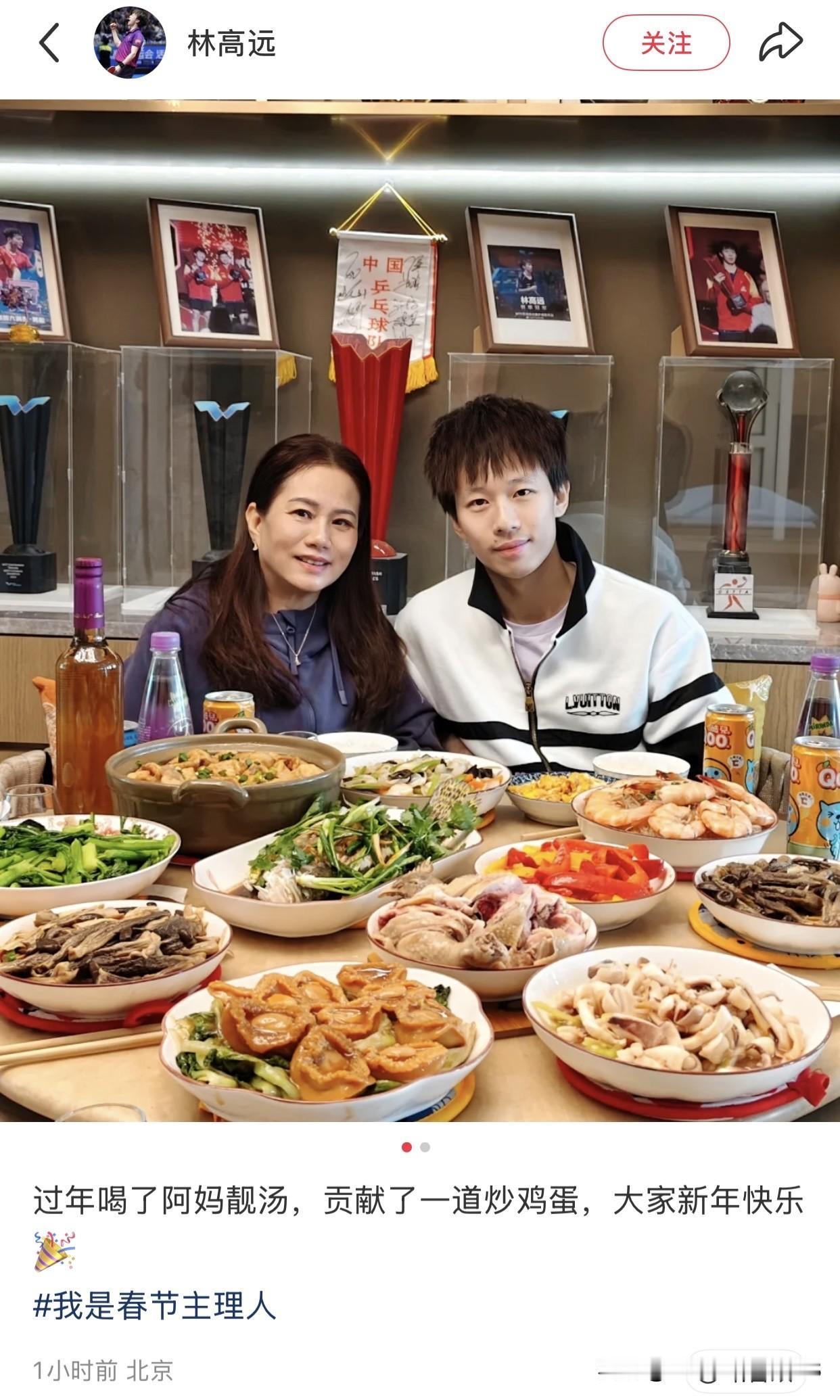 林高远晒和妈妈的新年合影,年夜饭自己做了炒鸡蛋。 2.19日,高远发文祝大家新年