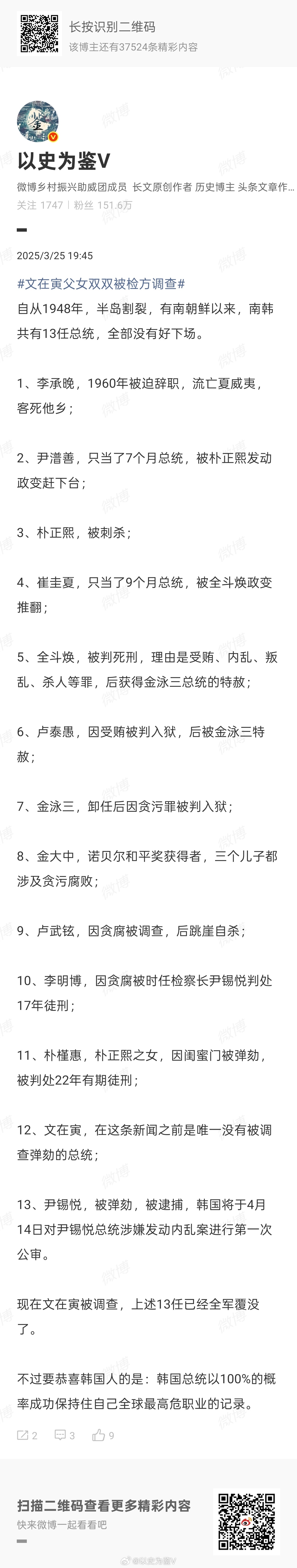 尹锡悦被判无期徒刑韩国有史以来13任大统领,目前仅有文在寅现在还在吃西瓜(遭到腐败调查但是现在还没进去)……