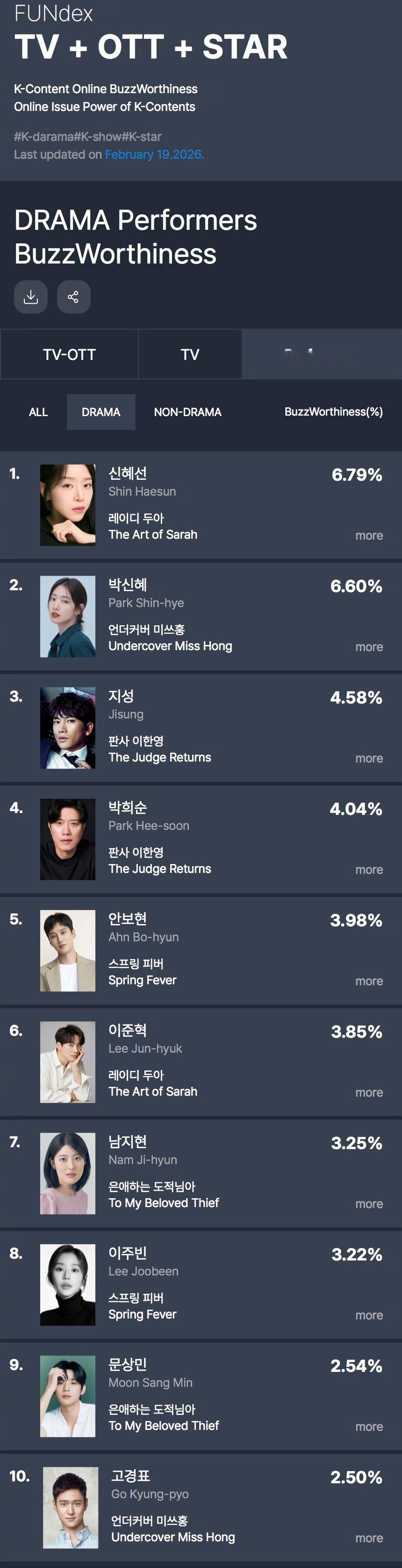 GOODDATA公布2026年2月第2周电视剧出演者话题性排行。1.申惠善 莎拉的真伪人生 6.79%2.朴信惠 卧底洪小姐 6.60%3.池晟 法官李汉英 4.58%4.朴熙顺 法官李汉英5.安普贤 春日狂热6.李浚赫 莎拉的真伪人生7.南志铉 恩爱的盗贼大人8.李主傧 春日狂热9.文相敏 恩爱的盗贼大人10.高庚杓 卧底洪小姐