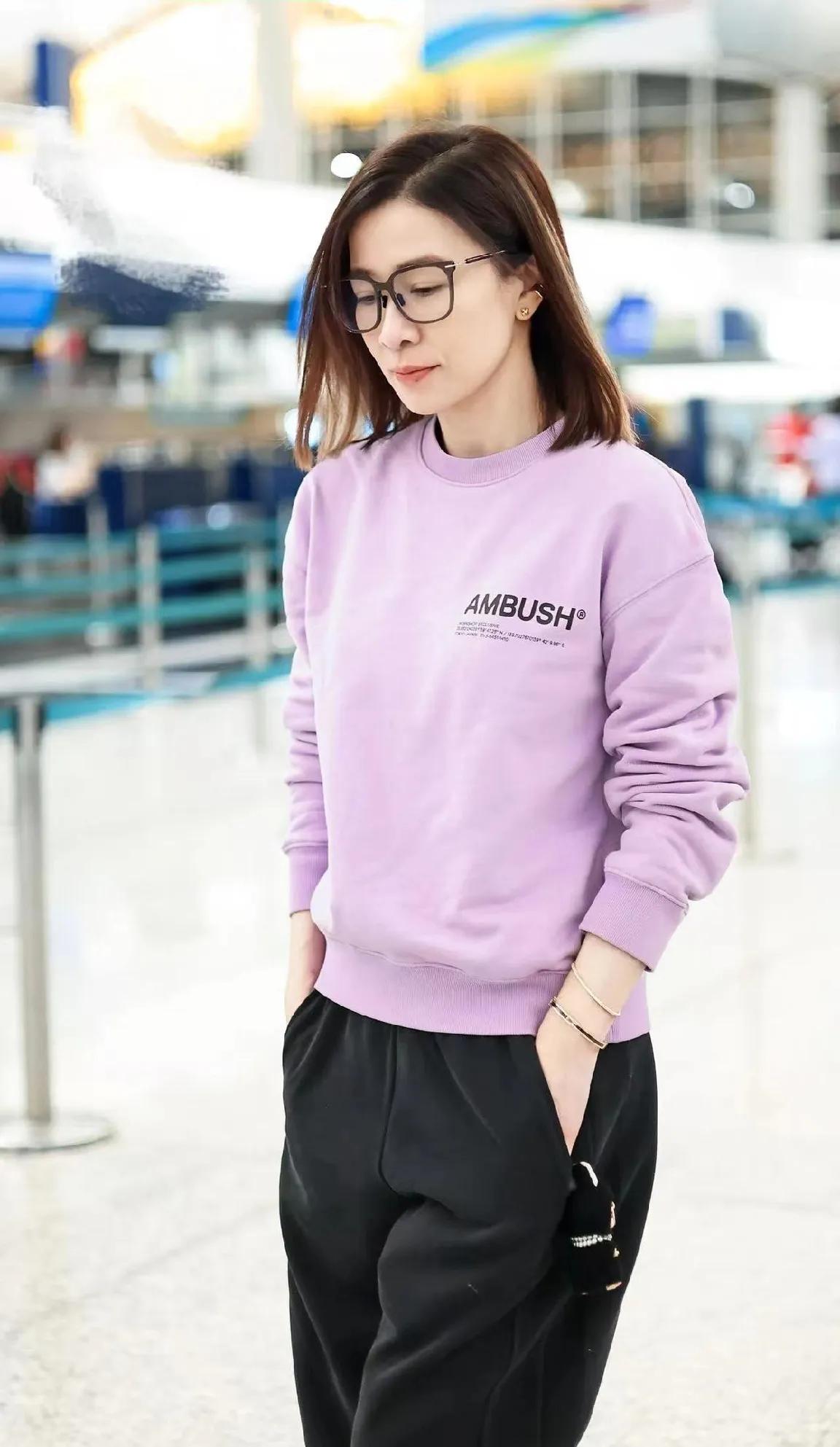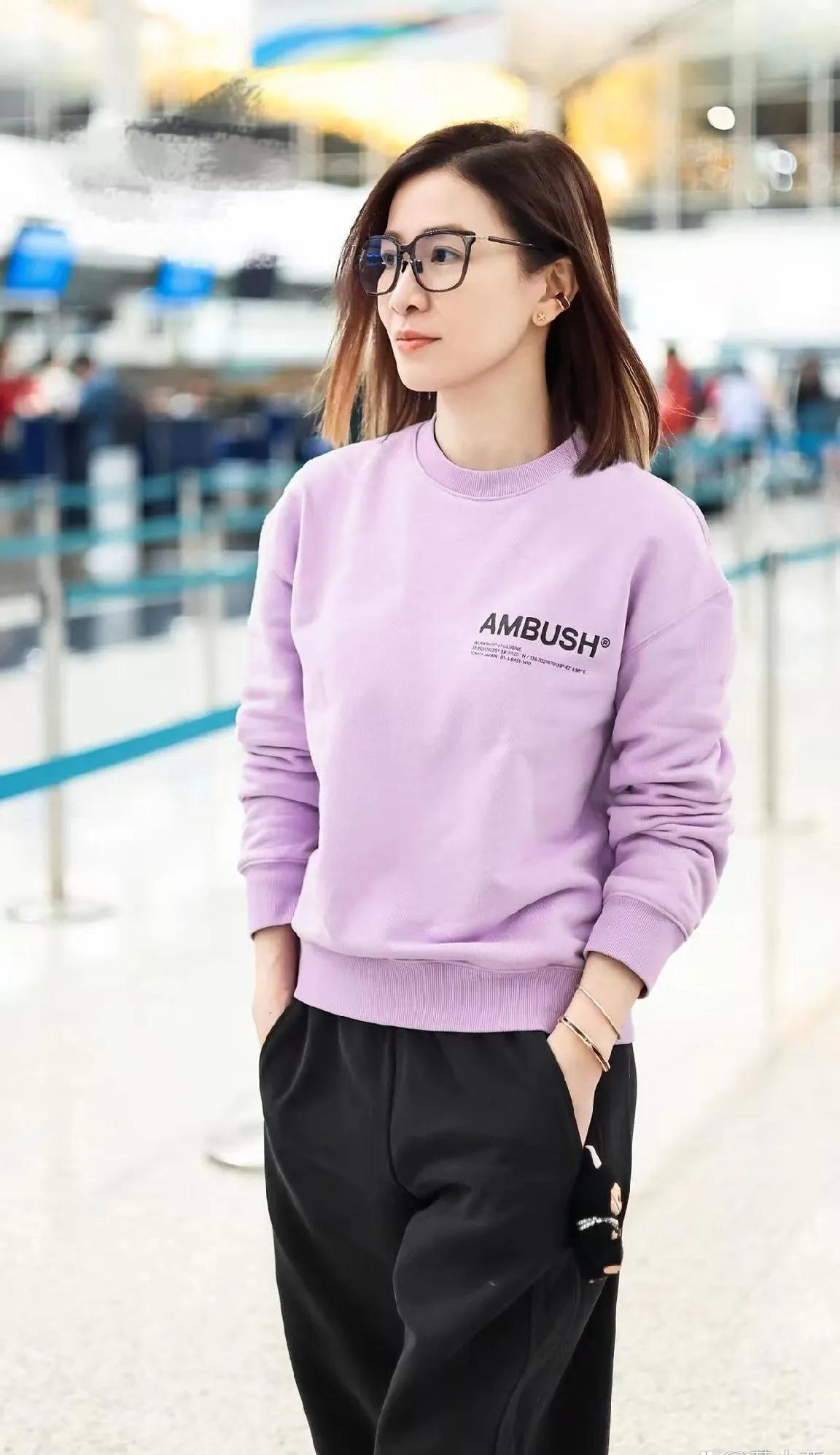 佘诗曼的机场私服也太会穿了吧!💜 淡紫色卫衣搭配黑色休闲裤,慵懒随性又减龄,黑框眼镜一戴,瞬间文艺感拉满。 笑起来眼睛弯弯的,亲和力满分,这状态谁能看出是姐姐辈的? 佘诗曼 机场穿搭 明星私服