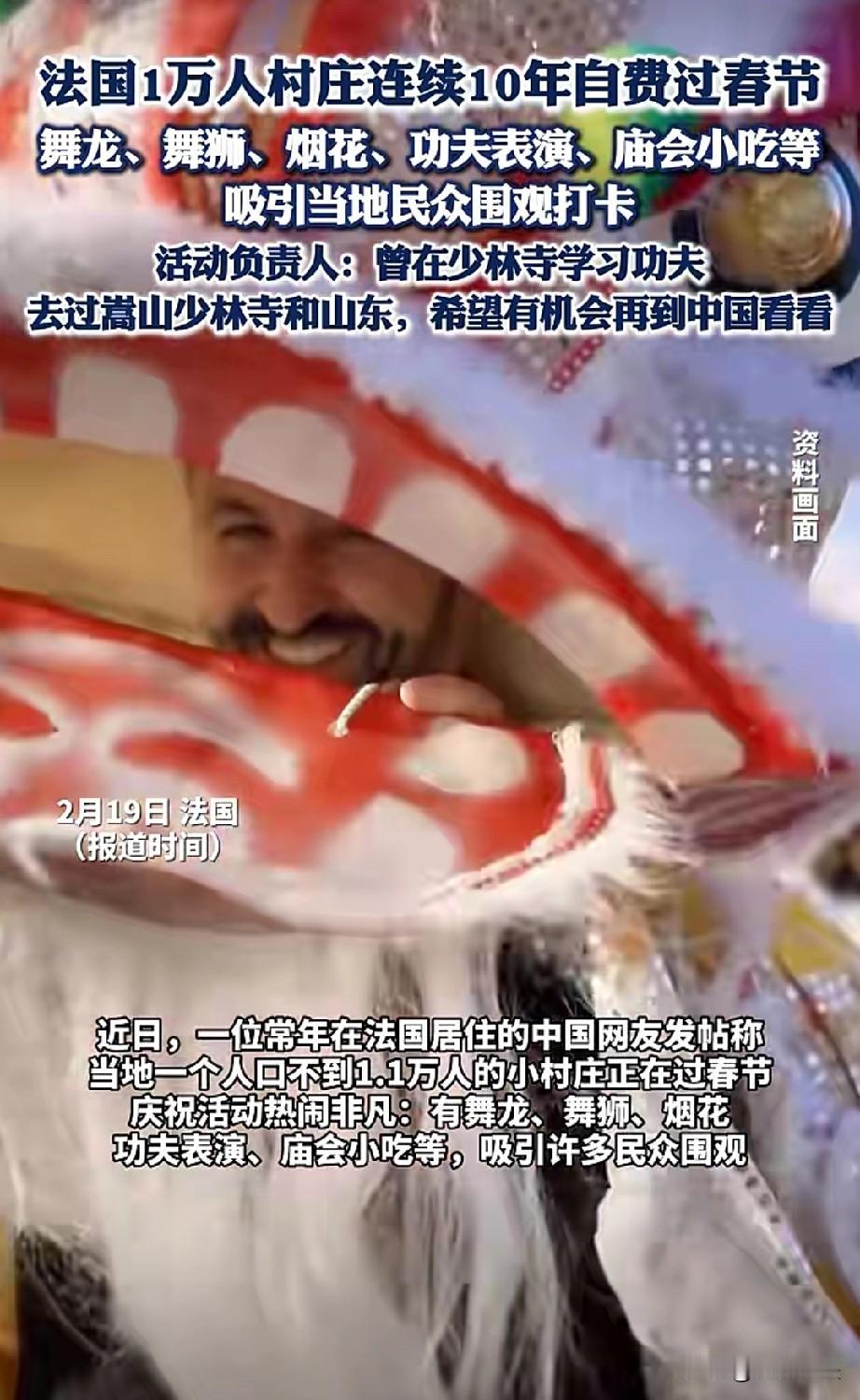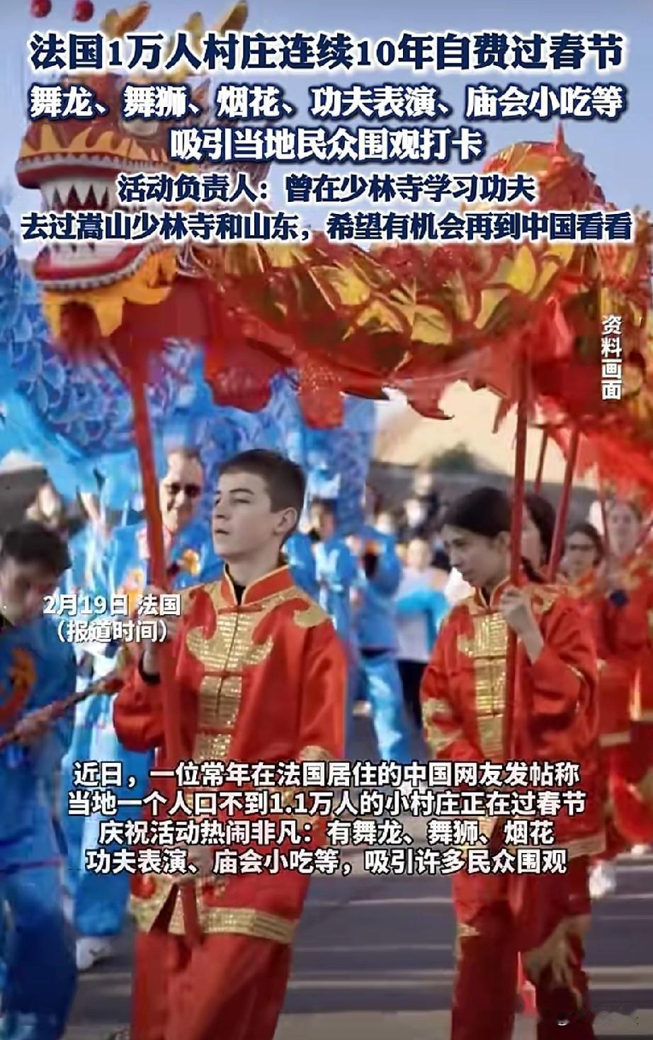 普天同庆,中国人庆祝春节的习俗传到了法国! 在塞纳河畔的一个法国村庄里,住着一个武术团,成员都是当地人,有150人左右,他们每年都会自发的举行庆祝春节的活动,现场有舞狮子、舞龙、中国功夫表演、烟花秀、庙会小吃等! 这一庆祝活动已经连续举办了10年,费用都是他们团体自己出的,因为他们都非常喜欢中国的传统文化。 该活动负责人称之前去过中国河南嵩山少林寺学习中国功夫,也去过历史文化悠久的山东,对中国传统文化非常感兴趣,希望有机会再去中国看看! 庆祝春节,作为中国人最看重的一个习俗,已经走出国门传到了全世界,目前世界上已有近20个国家把春节列入了法定节假日,包括越南、朝鲜、韩国、新加坡、马来西亚等近20个国家! 世界上有将近200个国家都会自发的举行一些庆祝春节的活动,包括美国、英国、法国、日本、加拿大等等! 春节能够得到世界很多国家的认可,与中国综合国力的不断强大,中国在世界上的地位不断提高,中国对世界和平发展做出的突出贡献密不可分! 中华崛起,普天同庆!