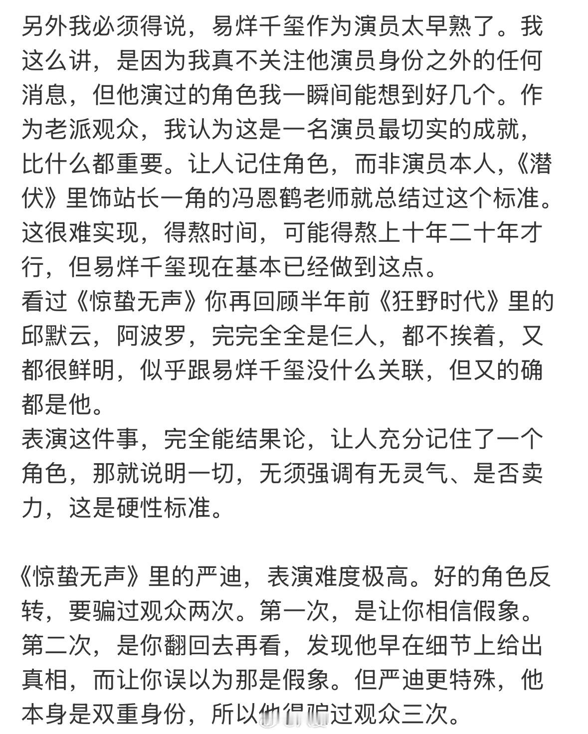 易烊千玺朱一龙撑起了惊蛰无声 《惊蛰无声》片名说的就是易烊千玺严迪本人吧,惊蛰是办案子,无声是抓钉子!既要沉下心查案、梳理线索,又要时刻绷紧神经抓内鬼,完美呼应影片核心。用细微的表情把严迪的挣扎、坚定全演出来了,完完全全给角色注入了灵魂,易烊千玺严迪给到一个夯!