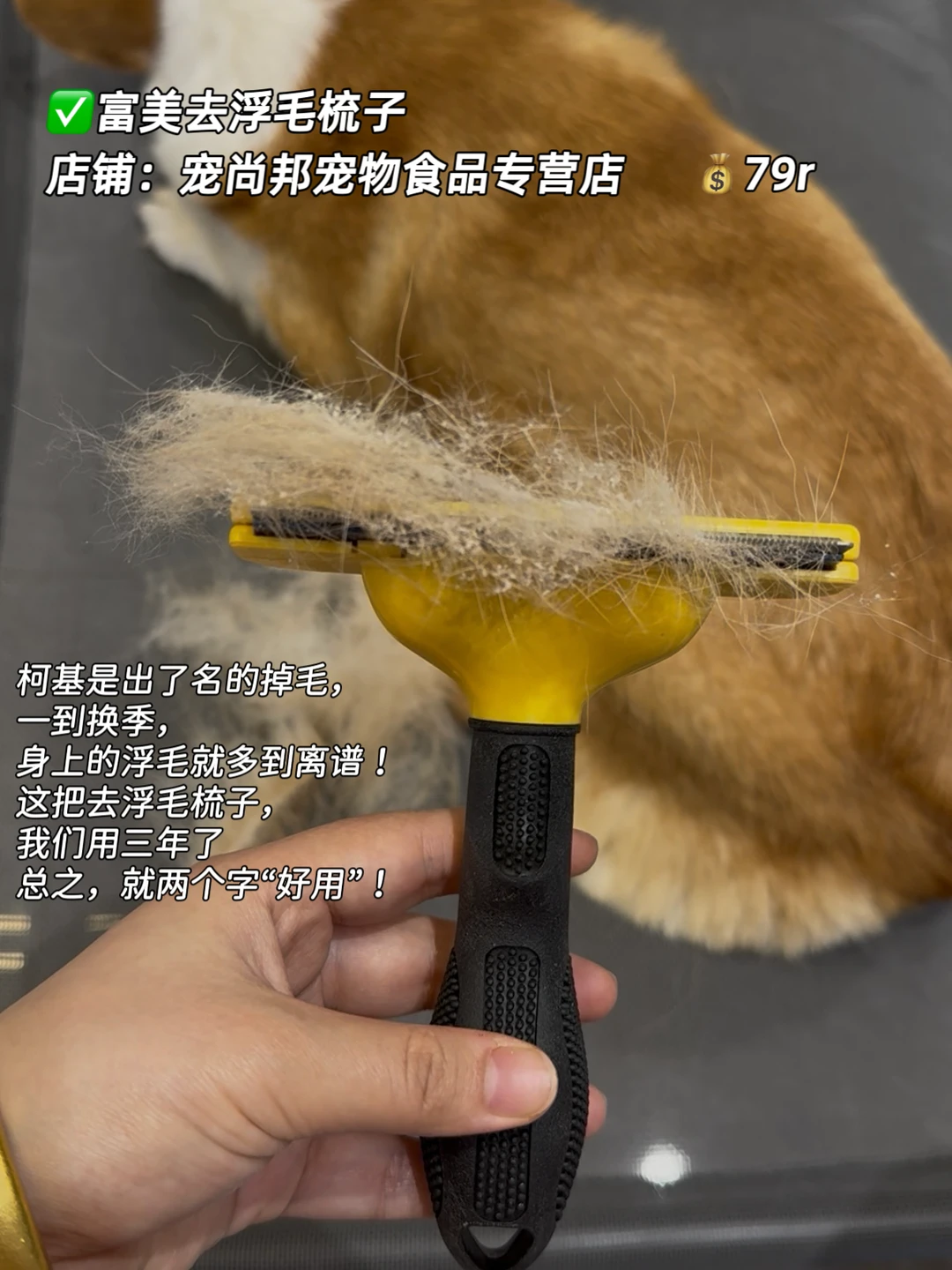 柯基是出了名的掉毛,一到换季,身上的绒毛绒毛就多到离谱!这把去浮毛梳子,我们用三年了,总之,就两个字“好用”!