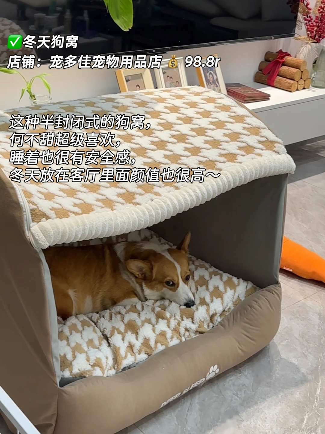 这种半封闭式的狗窝,何不甜超级喜欢,睡着也很有安全感,冬天放在客厅里面颜值也很高~