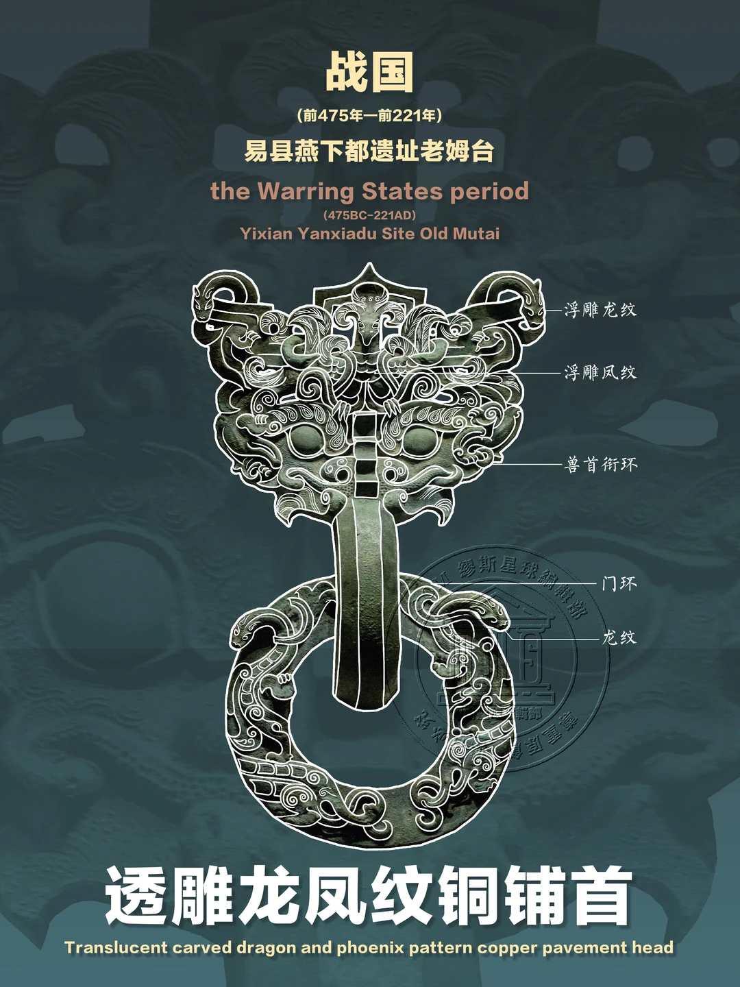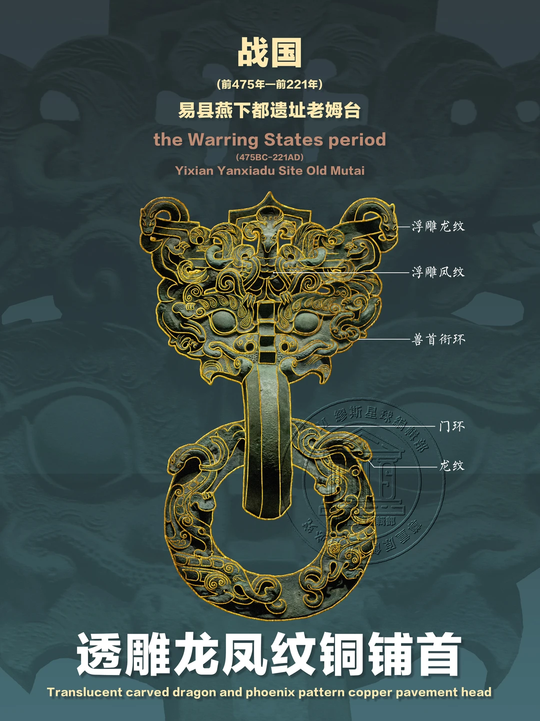 📍透雕龙凤纹铜铺首作为战国时期铜铺首,为考古文物中少见器物,专家们甚至可由此文物推断出燕下都宫殿大致规模。