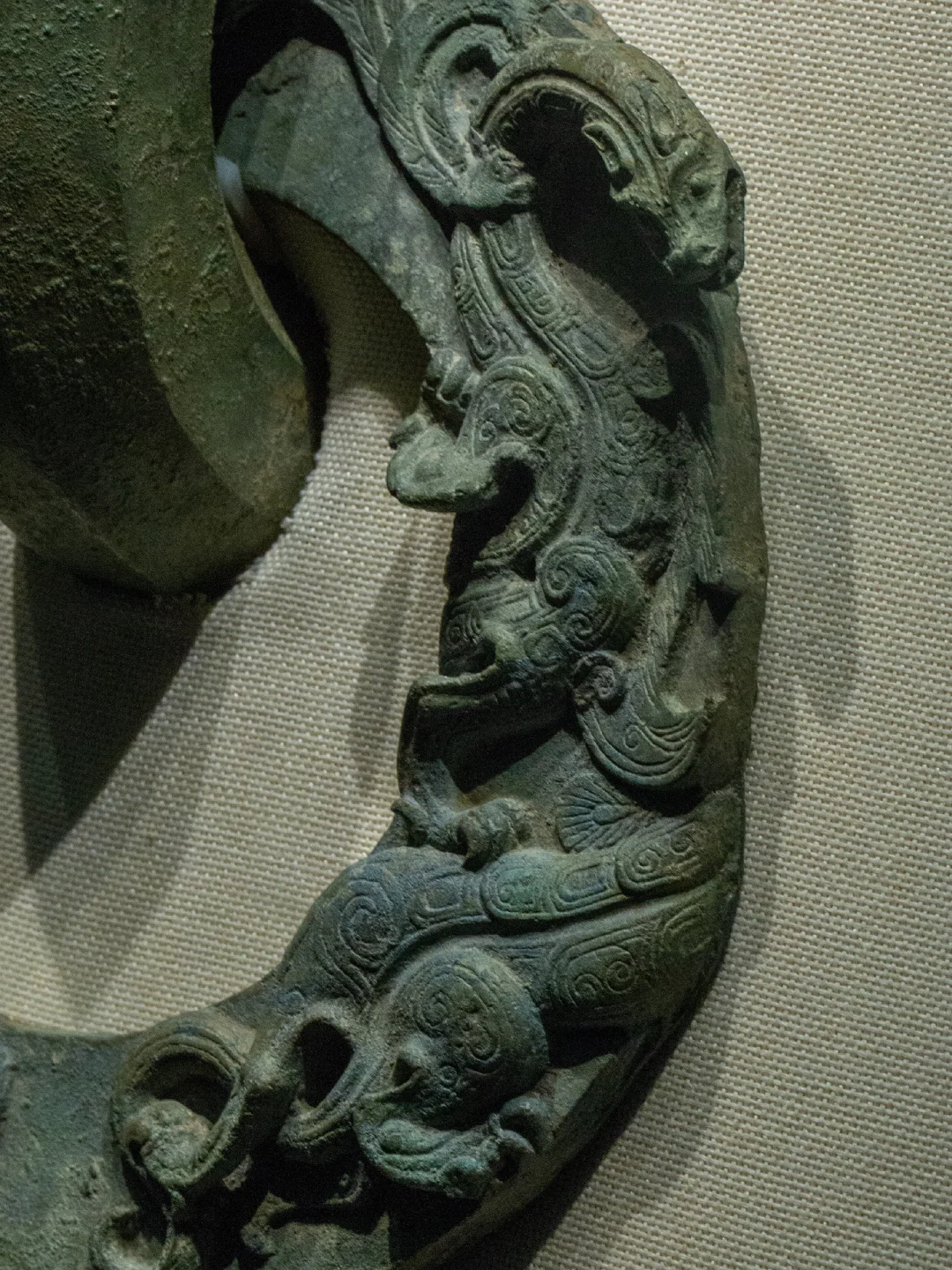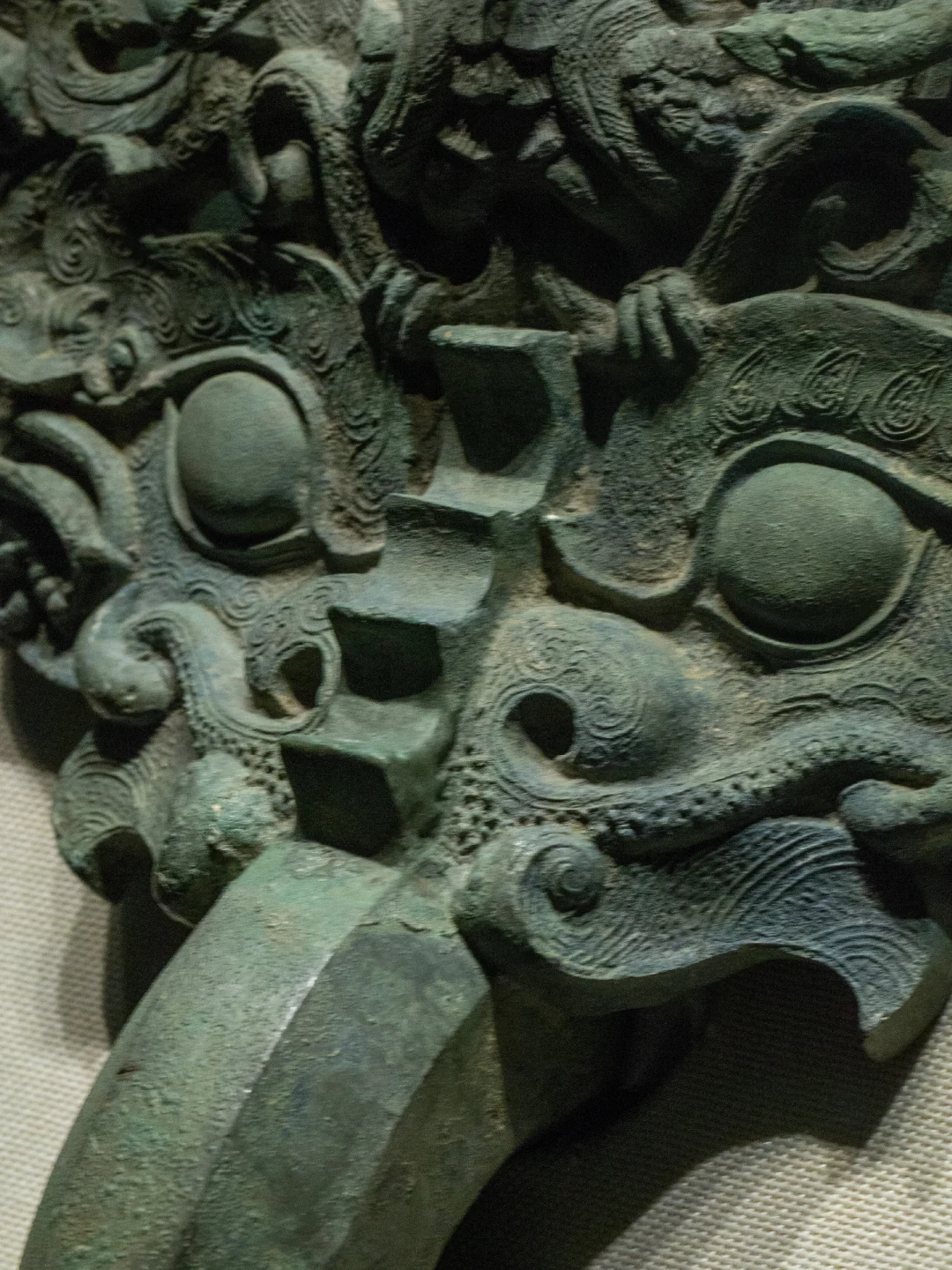 📍整个战国透雕龙凤纹铜铺首,长74.5厘米,宽36.8厘米,重21.5公斤。采用浮雕和透雕相结合的铸造工艺,作兽面衔环状。从整体看,透雕龙凤纹铜铺首是兽首衔环的造型,兽首主体是我国古代传说中的怪兽饕餮。饕餮是传说中一种凶猛无比且贪吃的怪兽,我们可以清楚地看见,瞪大着眼睛,张着大嘴,嘴角边露出锋利的牙齿。