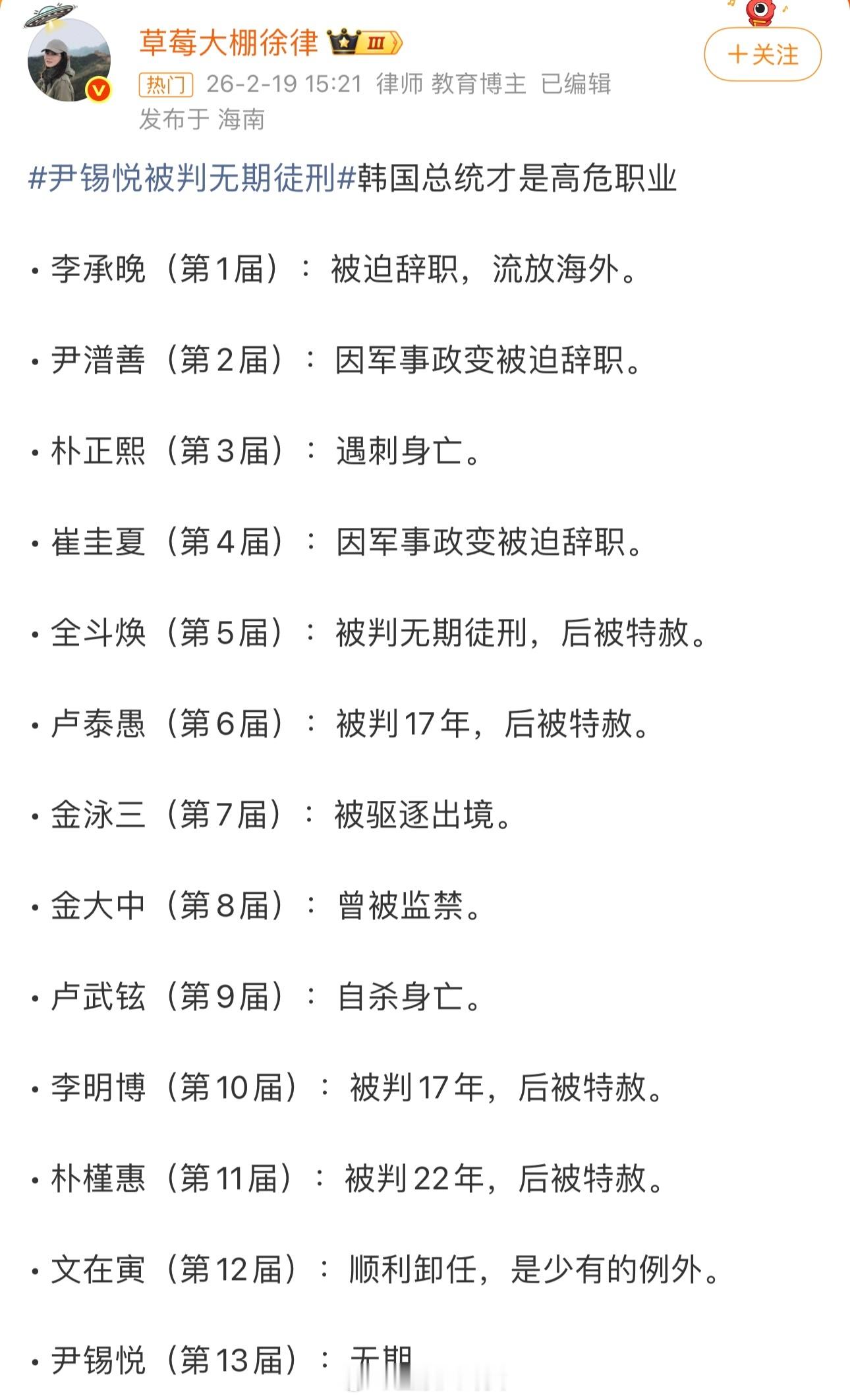 尹锡悦被判无期徒刑韩国总统才是高危职业