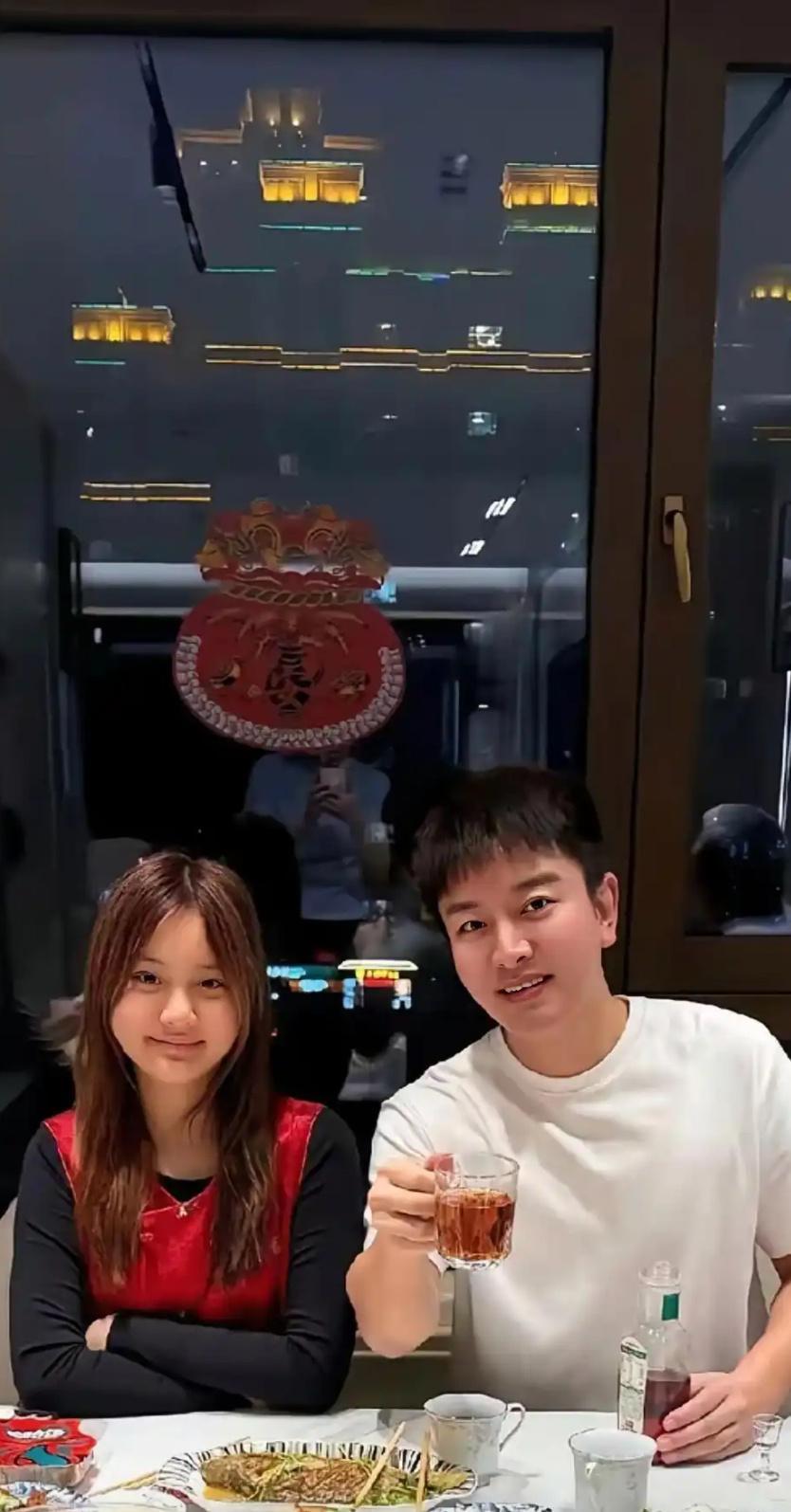 贾乃亮甜馨年夜饭合照玻璃上有影子,大家能看清是谁在帮他们拍照吗?