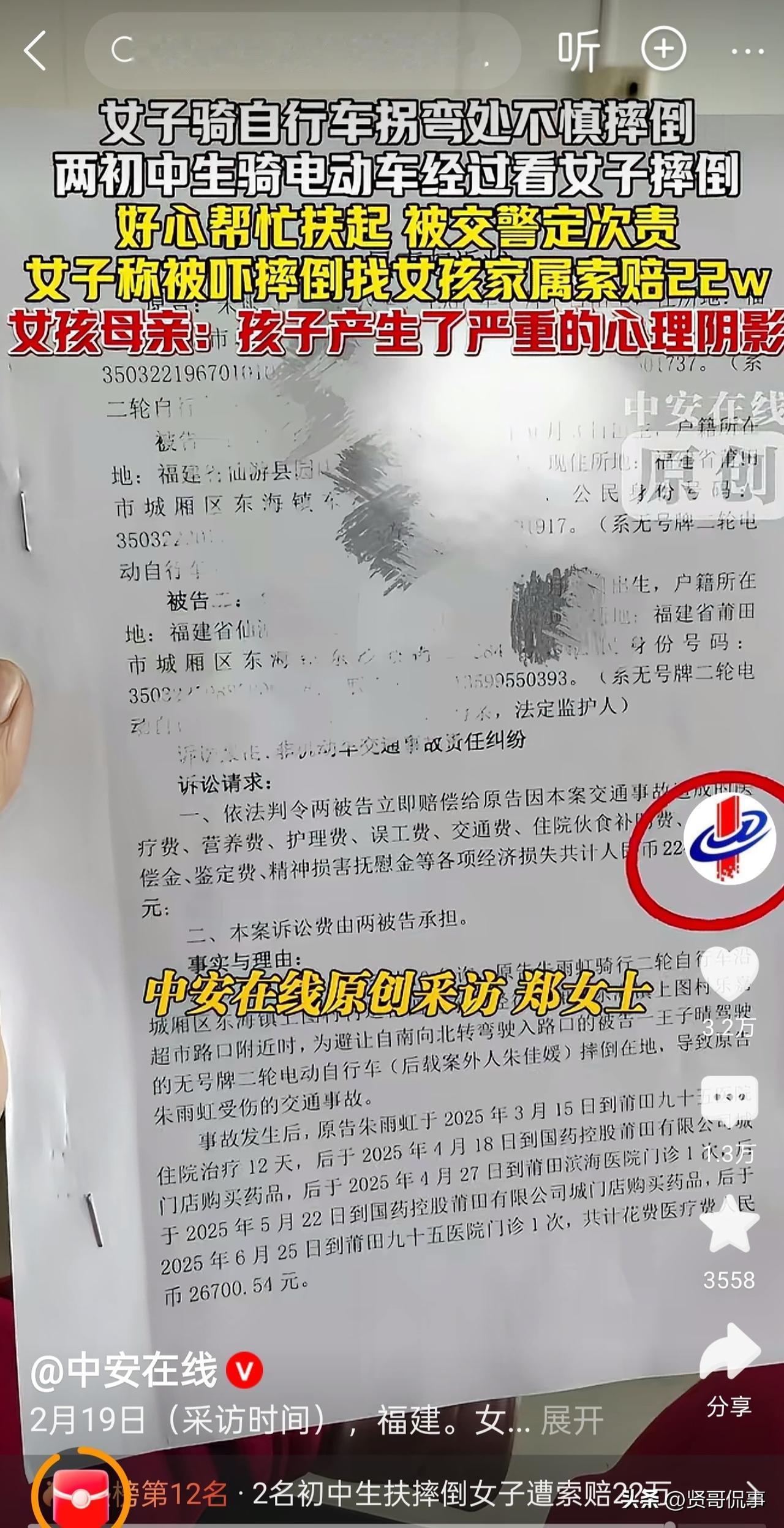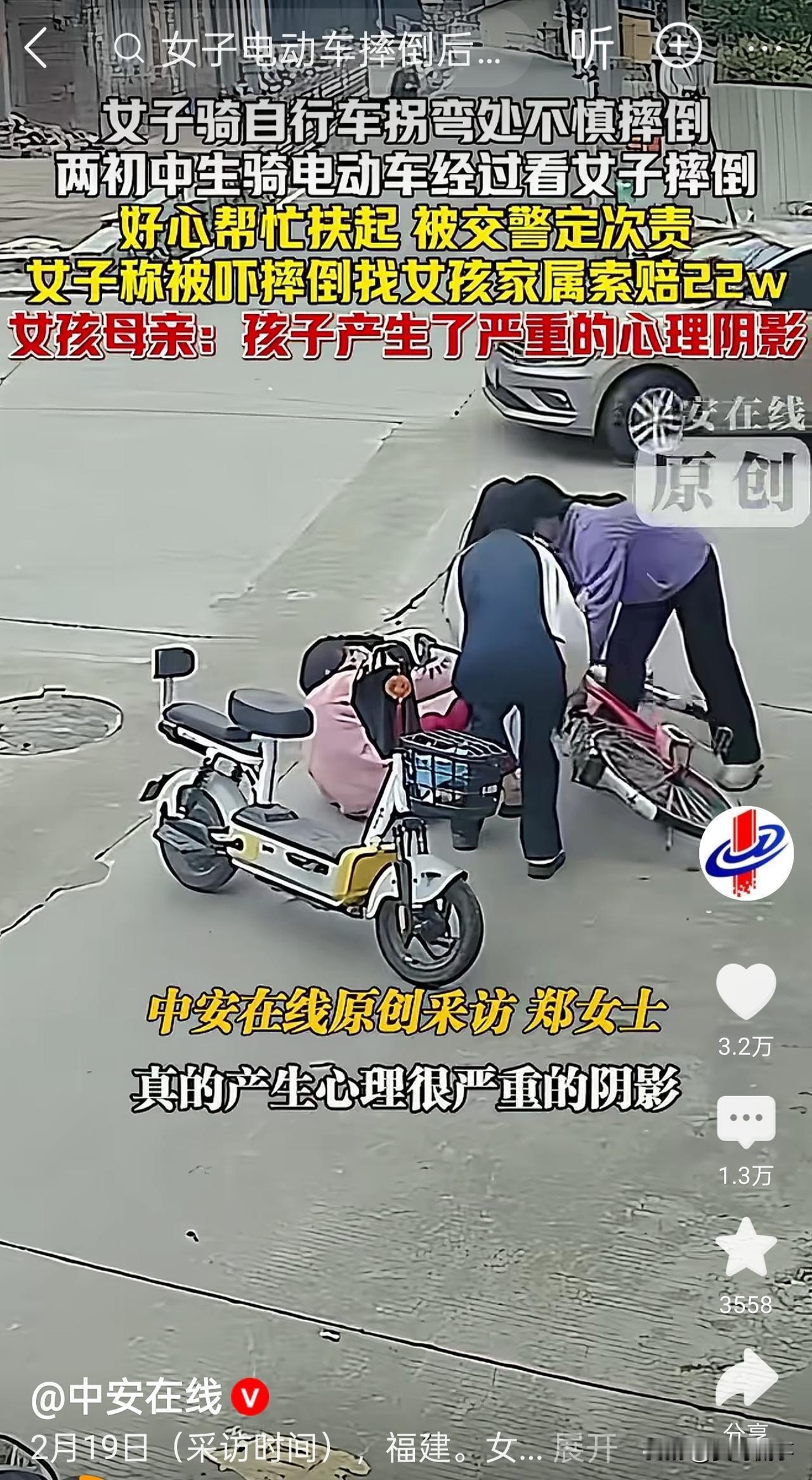 福建,两名初中女生,因为扶起一名摔倒的陌生女子,不仅被认定负事故次要责任,还被对方告上法院,索赔高达220000余元的赔偿金。网友:“原本纯真的善意,被现实狠狠泼了一盆冷水。” 事发当天,小林和小陈悦像往常一样骑着电动车外出。 当她们行至一处拐弯时,一辆白色轿车先行驶过,紧接着,路边一名骑自行车的女子突然连人带车摔倒在地。 女子摔倒后,多次尝试起身都因为腿部受伤无法动弹,看上去很痛苦。 看到有人受伤,两个女孩出于好心,便立刻停下车上前帮忙。 她们一左一右,小心翼翼地将摔倒的女子扶了起来,还帮忙扶起了自行车。 在她们心里,这只是遵从老师和父母的教导,做了一件力所能及的好事,是再正常不过的善意之举。 可让她们万万没想到的是,这份好心没有换来一句感谢,反而等来了警察。 女子当场报警,并称自己是被两名女孩突然出现的电动车吓到,才导致摔倒的。 随后交警到达现场调查,将这起事件定性为无接触事故,并认定两名女生承担次要责任。 这还不算完,女子事后还拿着责任认定书,直接将两名女生及其家长起诉至法院,要求赔偿医疗费、赔偿金等各项费用在内共计224000余元。 自此,曾经活泼开朗、爱笑的小林和小陈开始逐渐变得沉默寡言、胆小自卑。 她们非常不解:明明打小就被灌输要学雷锋做好事,她们只是扶起了摔倒的阿姨,怎么还要赔偿,到底哪里做错了? 父母们看着孩子备受煎熬,既心疼又无力,明明是出于善意,却要为莫须有的惊吓承担责任,还要面对巨额的索赔,这到哪里说理去? 此事一经曝光,也引发了广大网友的热议。 大多数人都表示心疼小林和小陈,觉得她们做了好事却没有好报; 也有人认为,即便小林、小陈违规骑电动车不妥,但她们和女子没有接触,且扶人行为发生在摔倒之后,不该因此被追责索赔; 还有人感慨道:“这样的事情一再发生,只会让越来越多人不敢再伸出援手,遇到这样的事情,全部冷漠对待。” 诚然,从事发当时的监控视频来看,我们不得承认,两名女孩在骑行上,确实存在相应的过错: 第一,女孩骑行时靠左行驶,违反了基本的通行规则; 第二,女孩转弯时没有减速、没有仔细观察路况突然出现的电动车,客观上确实容易让道路上的其他行人受到惊吓。 可能也正是基于这两点,交警认定女孩承担次要责任。 但这也不意味着,女子就能狮子大开口。 双方在当时未发生任何物理碰撞;女子摔倒在先、女孩到达在后,其摔倒并非女孩违规导致的必然结果。 女子摔倒的核心原因还是在于她自身驾驶技术生疏、操作不当,再加上年纪较大、反应迟缓、精神过度紧张所致,与女孩骑行无民事上的因果关系,故不应承担责任。 退一步讲,即便有责任,也应是很小的责任,加上女孩事后又主动将其扶起,对明事理的人来讲,可能就不会去追究女孩的责任,更不会这样去漫天要价、去消耗他人善意。 目前,该案定于2月26日开庭审理,结果如何?大家拭目以待。 总的来说,这件事早已不是简单的交通事故,而是对社会善意的又一次考验。我们支持该承担的责任绝不逃避,但更不该让善意被讹诈、被消耗、被伤害。 对此,你怎么看呢?欢迎大家在评论区留言。