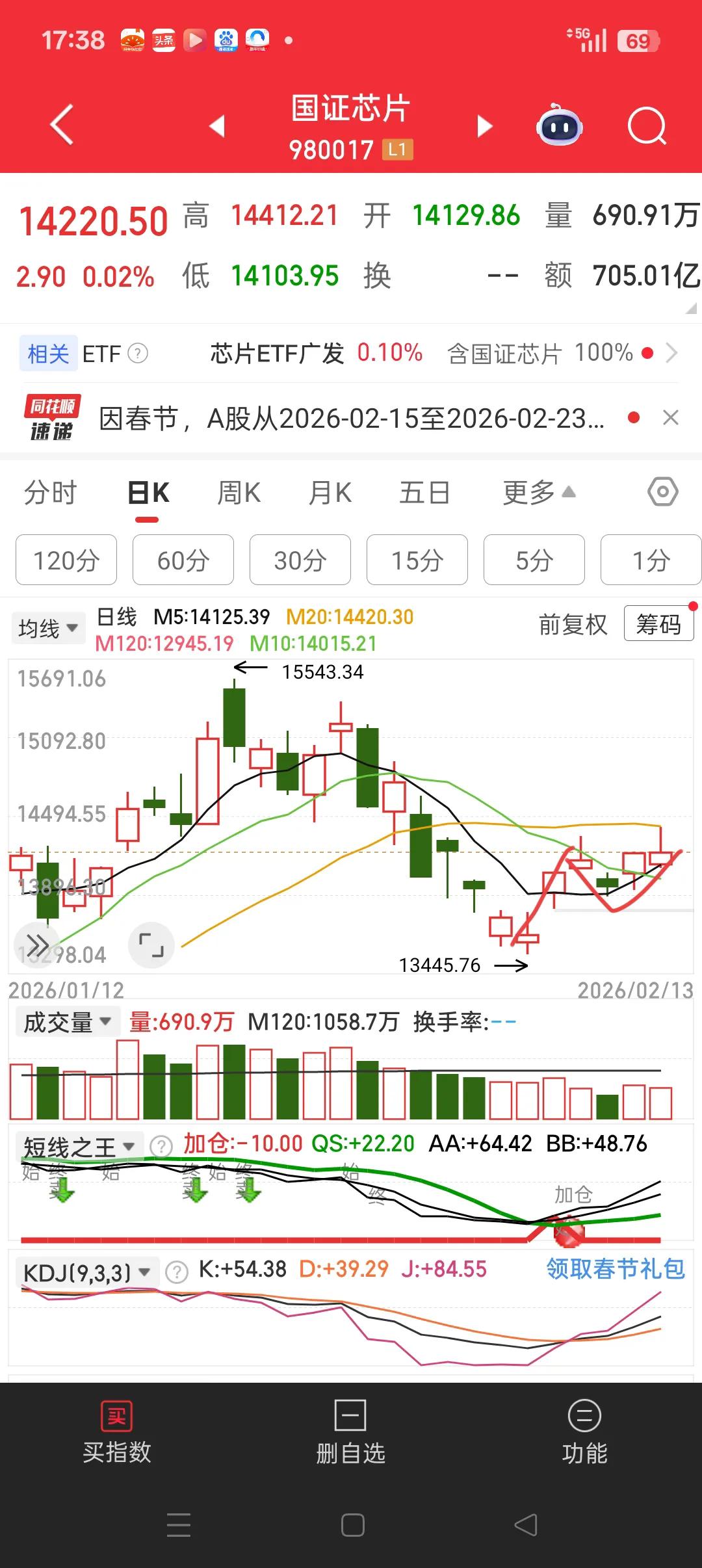 芯片半导体已有明显的止跌企稳信号。右侧连续3日上涨之后,回调,但没有再创新低。回调靠近5日线之后迅速拉回,并于两天后突破前高,形成了经典的N字形结构,这是右侧交易的买入信号。 况且5日线已上穿10日线,但目前还受到了20日均线的压制,有一点冲高回落的迹象。如果没有特别大的利好,它不会一飞冲天。可能会通过震荡慢慢向上突破,科技主线依然成立。 不知道我讲的对不对?希望能听到您不一样的声音。