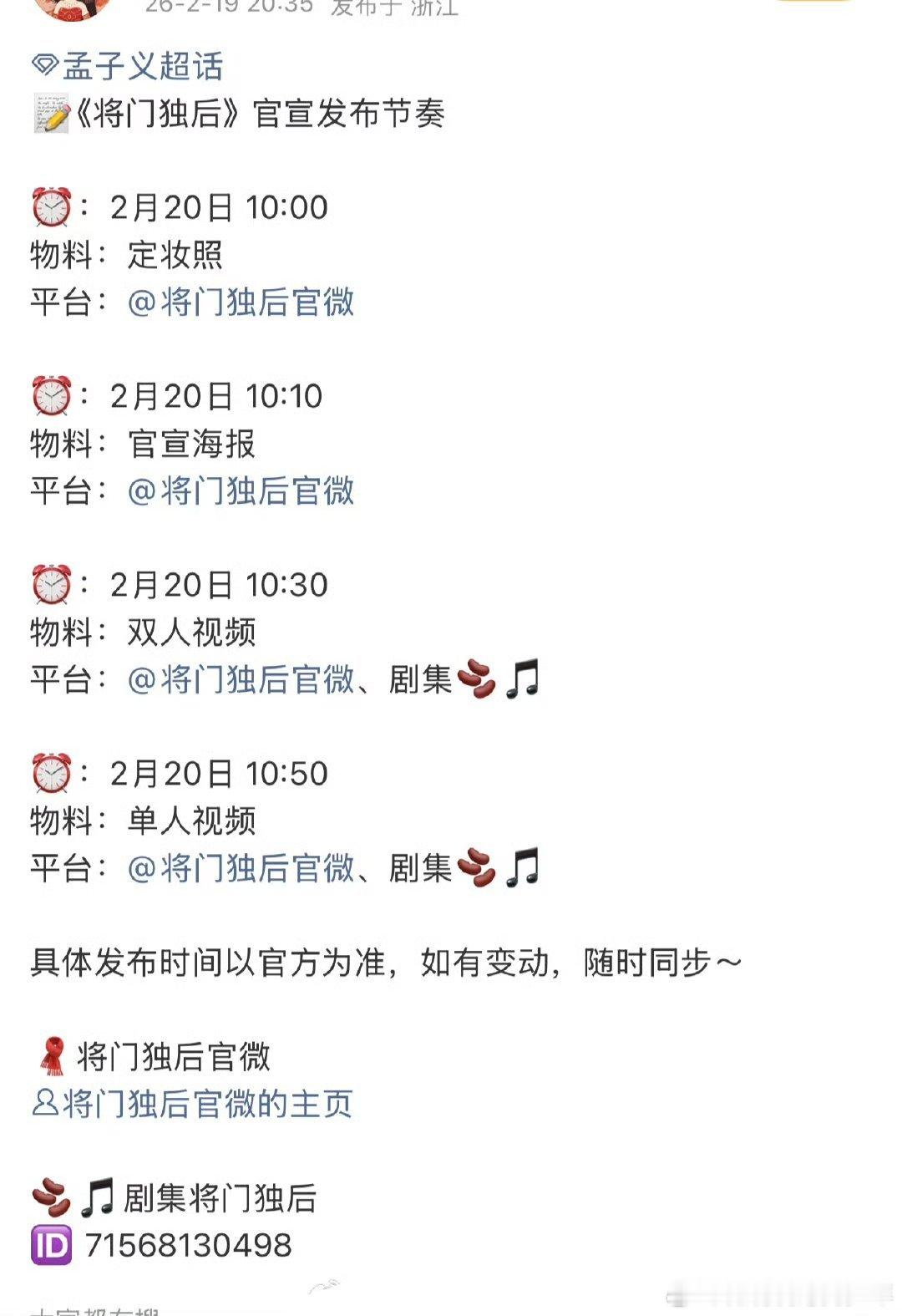 孟子义《将门独后》明天官宣物料发布节奏,定妆造➕单人视频,期待沈妙
