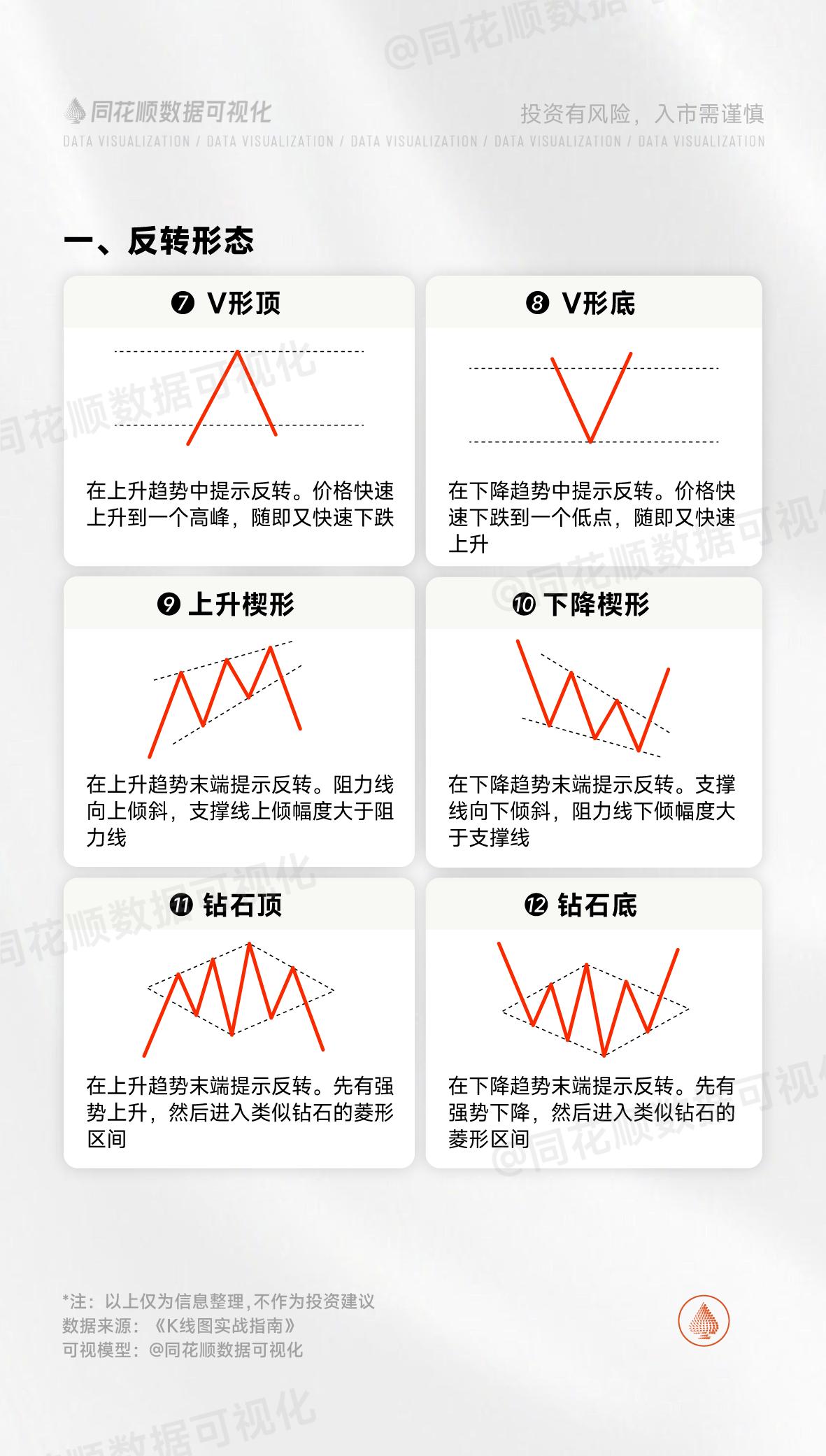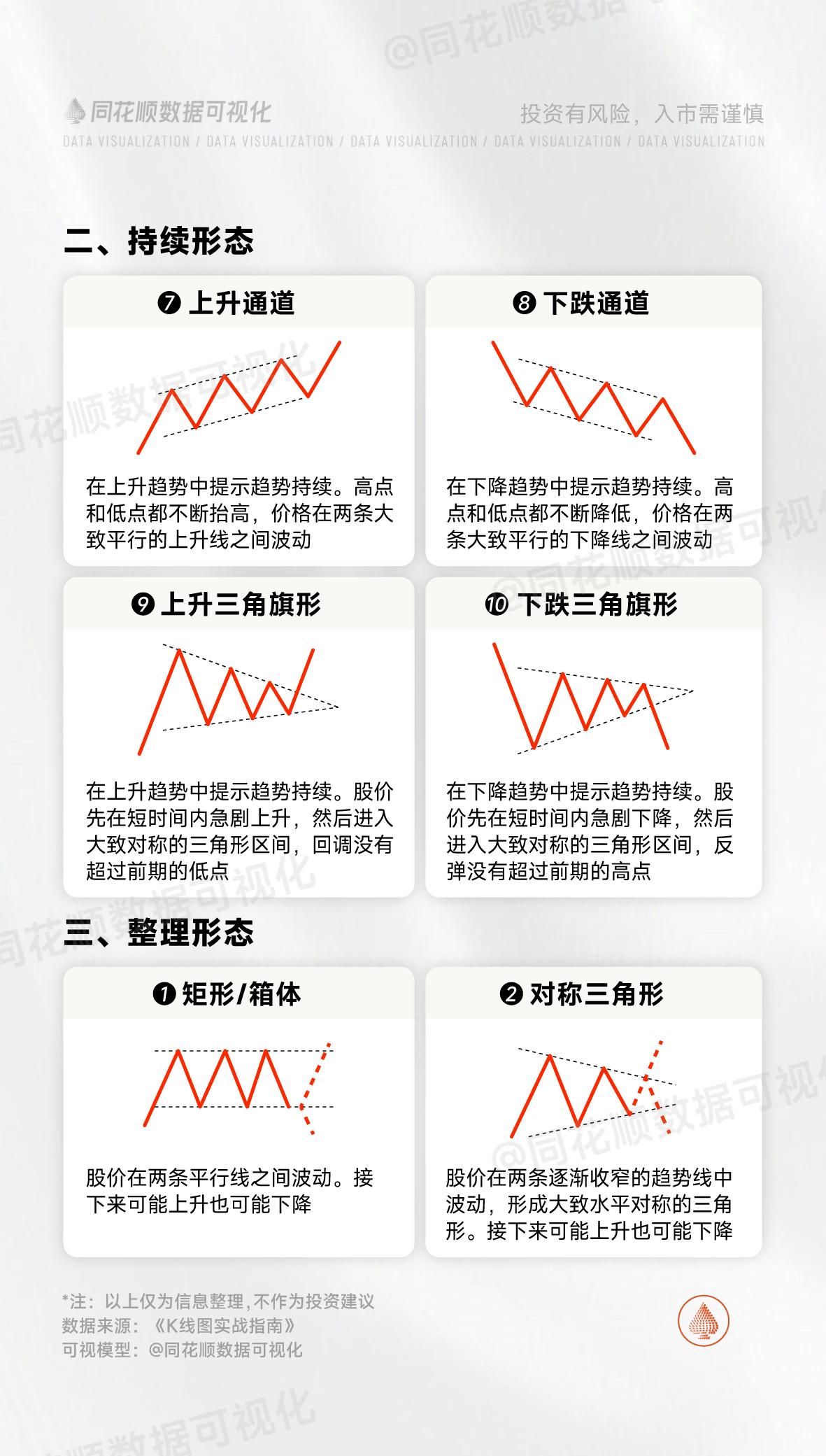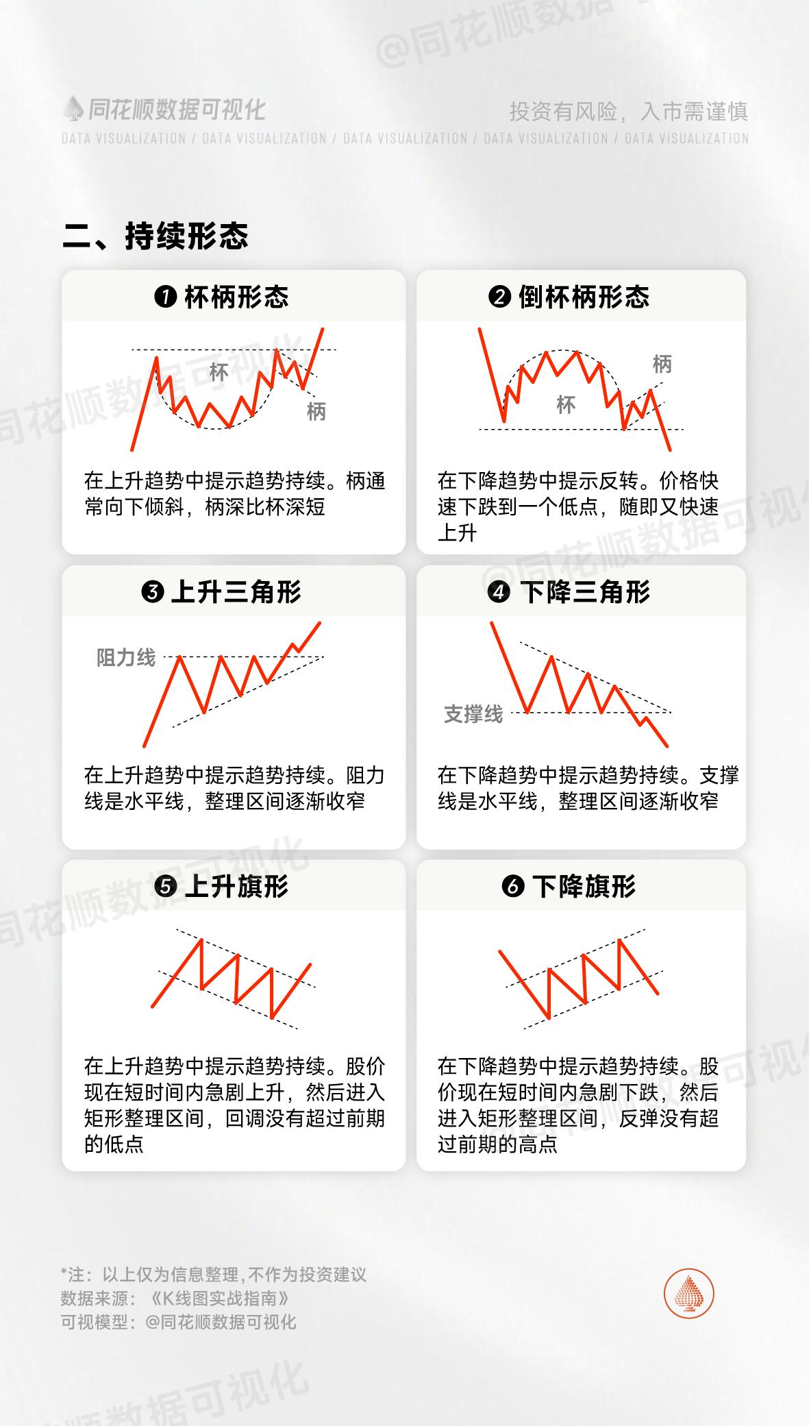炒股新手必学K线形态大全!!! 一、反转形态:经典的双重顶,短期在上升趋势中,两次到达某一高点附近都无法突破,后期向下趋势可能性极大,后续突破可能需要长时间震荡整理!!! 二、持续形态:经典杯柄形态,重点柄深比杯深短,一般都能突破前高,再创新高,该形态持续整理时间可能较长,需要有耐心持有!!! 三:整理状态:最经典的,也是常用的箱体形态,股价在两根平行线间上下波动,向上突破还是向下突破需要根据实际情况分析,如今年黄金走势,就是经典的突破箱体上沿,屡创新高的典范!!!