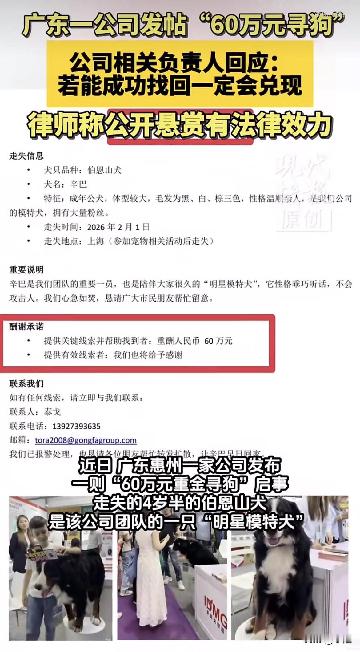 绝了!60万悬赏找一只狗,现在真线索出现了,捡到的人会送回来吗? 2月19号上午,广东那家悬赏60万找狗的公司接到一个电话。有个网友说,在虹桥花谷五区垃圾场后面的狗场里,看到一只伯恩山犬,长得跟辛巴一模一样 。 这个位置听着就让人心里一紧。垃圾场后面,狗场,这两个词放一起,画面感太强了。辛巴要是真在那儿,这20天是怎么熬过来的? 说回这只狗。辛巴不是普通宠物,是伯恩山犬,4岁半的公狗,37公斤,黑白棕三色,性格温顺 。这狗啥概念?伯恩山犬是大型犬,成年能长到40多公斤,市面上品相好的几万块起步,但这家公司把它当“明星模特犬”养,就是靠它拍照出镜的 。 2月1号下午3点,工作人员带辛巴去上海虹桥机场附近的南石桥路参加宠物活动,一个没看住,狗没了 。找了快20天,啥消息没有。派出所民警说近期丢狗的太多,暂时没线索 。 公司负责人付先生急了。直接甩出60万悬赏。网友第一反应都是:真的假的?炒作吧? 付先生回应得挺实在:这狗本身价值高,养了4年多,感情太深了。60万对公司来说不是拿不出的数,只要能找回来,这钱肯定给 。 有网友查了这家公司,惠州一家做宠物智能科技的初创企业,2025年7月才成立,注册资本500万 。说白了,这是家新公司,狗是他们的门面。狗丢了,相当于公司的形象代言人失踪了。 律师也站出来说话了,公开悬赏寻物有法律效力。《民法典》第499条写得明明白白,你公开承诺给钱,人家把事办成了,你就得给 。不给?法院见,到时候强制执行、冻结账户、列入失信名单,一个都跑不了 。 现在情况复杂了。19号上午那个线索如果是真的,狗在狗场里,那捡到的人肯定知道这只狗值钱。关键是,他看到60万悬赏公告了吗?看到了他会怎么选? 直接送回去拿60万?还是觉得狗场里待着也挺好?或者干脆装不知道,等风声过去再说? 还有个细节让人细思极恐。那个网友说的是“垃圾场后的狗场”。垃圾场后面开狗场,这是什么环境?什么性质的狗场?是收容流浪狗的,还是有别的用途?辛巴如果真在那儿,是被好心人收留了,还是另有隐情? 19号下午,有媒体记者多次拨打寻狗启事上的联系电话,一直无人接听 。付先生是在忙着核实线索,还是遇到了别的状况? 这个事儿走到现在,已经不是简单的丢狗找狗了。 60万悬赏,把人性赤裸裸地摆在了台面上。捡到狗的人,是冲着钱去,还是冲着善意去?送回去拿60万,有人说这是发狗财;不送回去,狗在狗场里受罪,又于心何忍? 要是你捡到辛巴,看到那张60万的悬赏公告,你会怎么办?