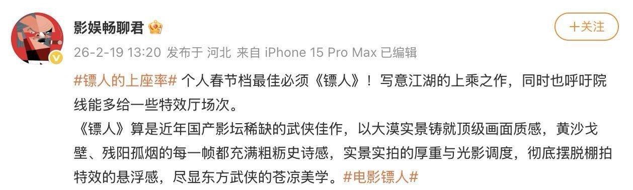 我们一起护住镖人这趟镖 吴京护的不只是镖,更是坚守武侠梦的动作演员。《镖人》实景实拍、真打实干,不用特效凑数,全是匠心诚意,这个春节一起守护硬核武侠!